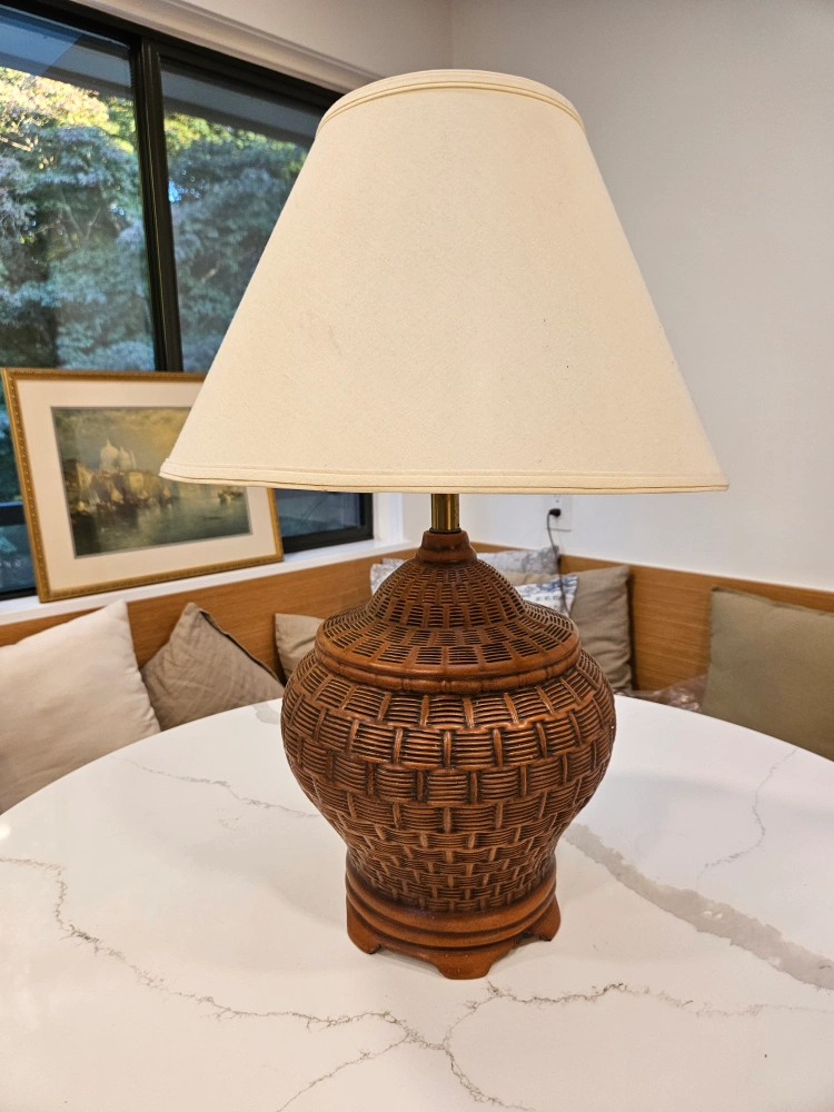 Large vintage ceramic table lamp with wicker details Linen Shade The lamp is in excellent condition, ready to brighten up your space