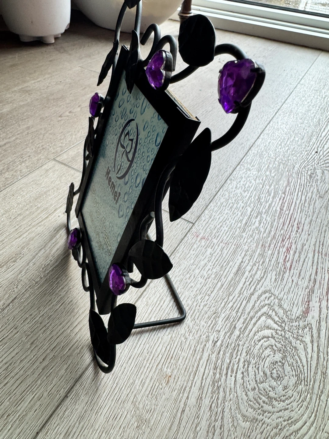 Metal frame with leaf design and purple gem accents. Holds a 3.5” x 5” photo. Great for home décor or gift. Like new.