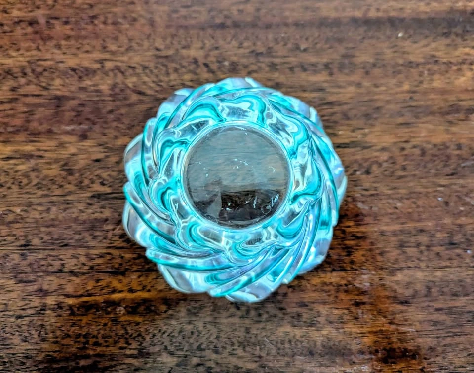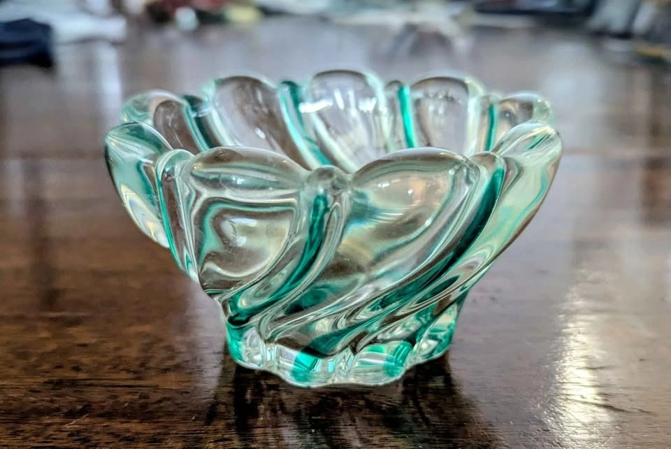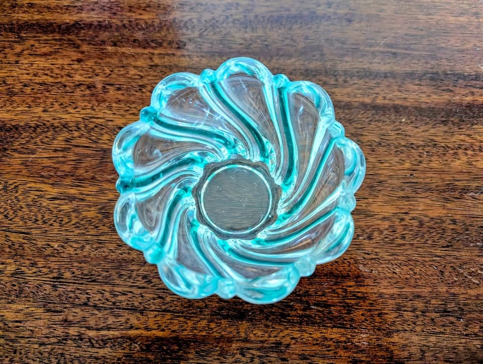 Vintage Italian Sommerso Green Spiraled Art Glass Bowl, c. Mid 20th Century. This Bowl would look exceptional while displayed in a Mid-Century inspired interior. The hand blown glass is nicely sculpted, showing a free-formed ruffled edge. This size bowl would make the perfect candy/nut dish, or used as an occasional decoration along an end table. The clear glass is accompanied by a vibrant turquoise spiraled motif, it's quite stunning. The underside of the Bowl is unsigned or marked. Condition: This Art Glass Bowl is in overall good condition without any cracks or chips. Mild surface scratches could be seen from age. Overall Dimensions: 15.5 cms wide x 7.5 cms tall x 15.5 cms deep Age: c. Mid 20th Century