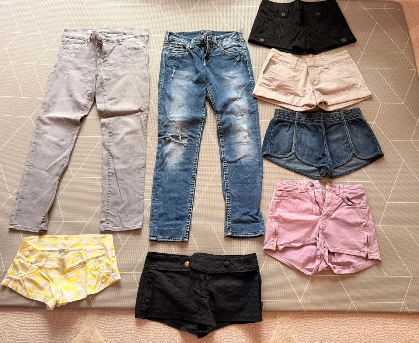 Selling a mixed lot of shorts and jeans in various styles and colours. There are denim jeans with a ripped design, as well as shorts in black, pink, beige, and yellow floral patterns. The jeans are size W27/31. Perfect for adding variety to your wardrobe! Pick up in Aurora