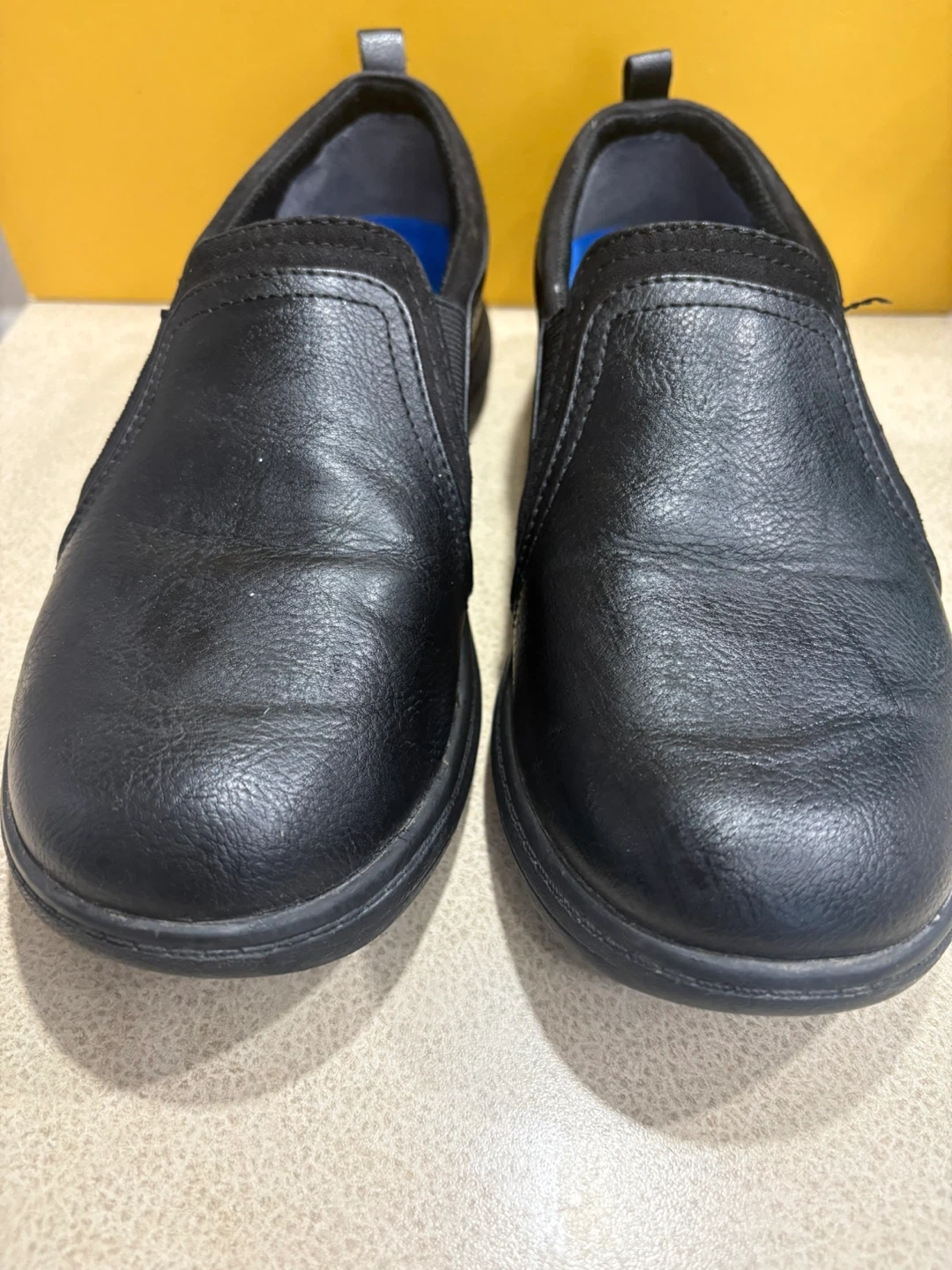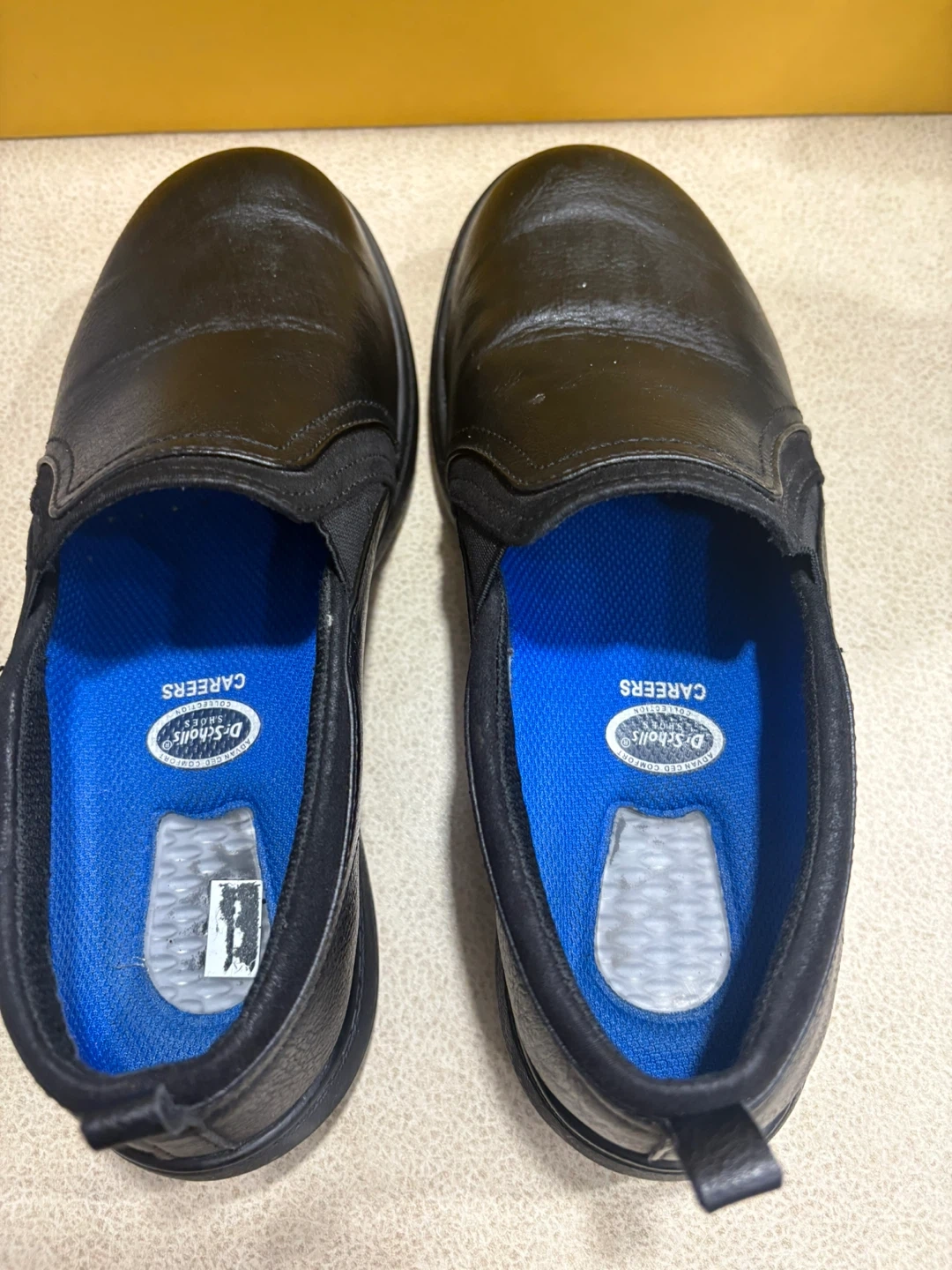 These are a pair of black leather slip-on shoes from Dr. Scholl's. They're in great shape and ready for a new home! They feature a comfortable design, perfect for everyday wear. Perfect for Restaurant work.