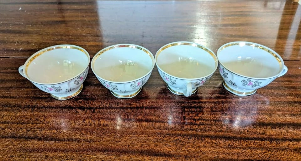 Gold plated teacups with beautiful pink flower and leaf designs. Interesting marking on the base of the teacup which only revealed it is manufactured in the USSR but can't find more details on it. No chips or cracks!