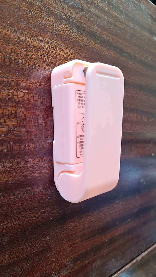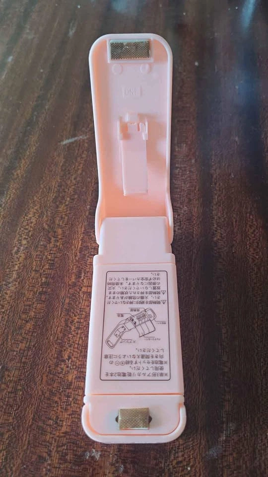 Light pink mini heat sealer. Uses 2 AA batteries. Size 9.5 cm x 3.5 cm x 3.5 cm. Comes with original box.