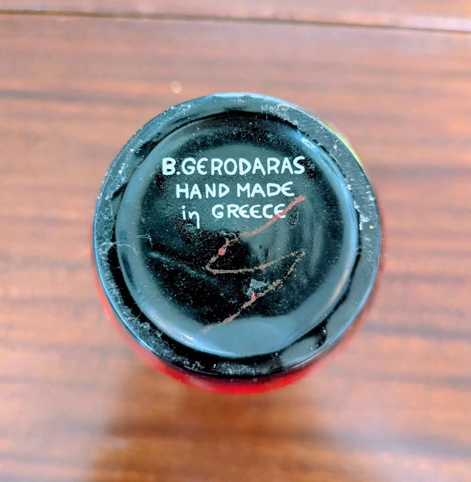 This hand-painted vase features intricate Greek-inspired motifs and a depiction of the Greek Goddess Artemis. Its rich, deep red and black hues, combined with the geometric patterns and detailed artwork, make it a statement piece. Perfect for adding historical charm and artistic flair. Handmade in Greece by B.Gerodaras. Vase is in excellent condition with no cracks or chips! Approx 15 cms Tall and 9 cms wide.