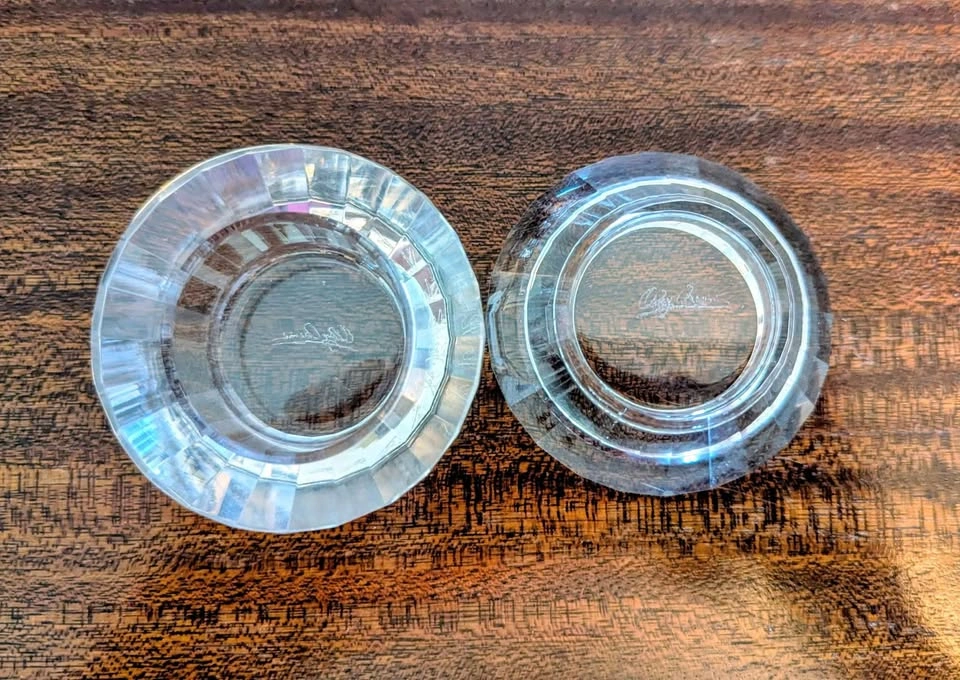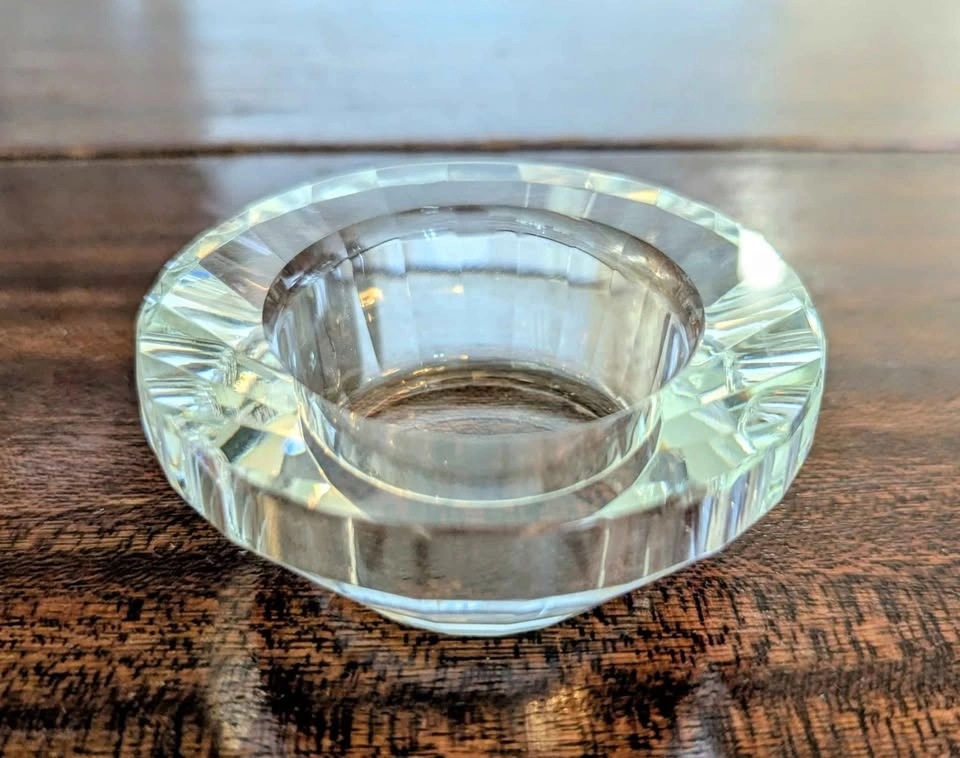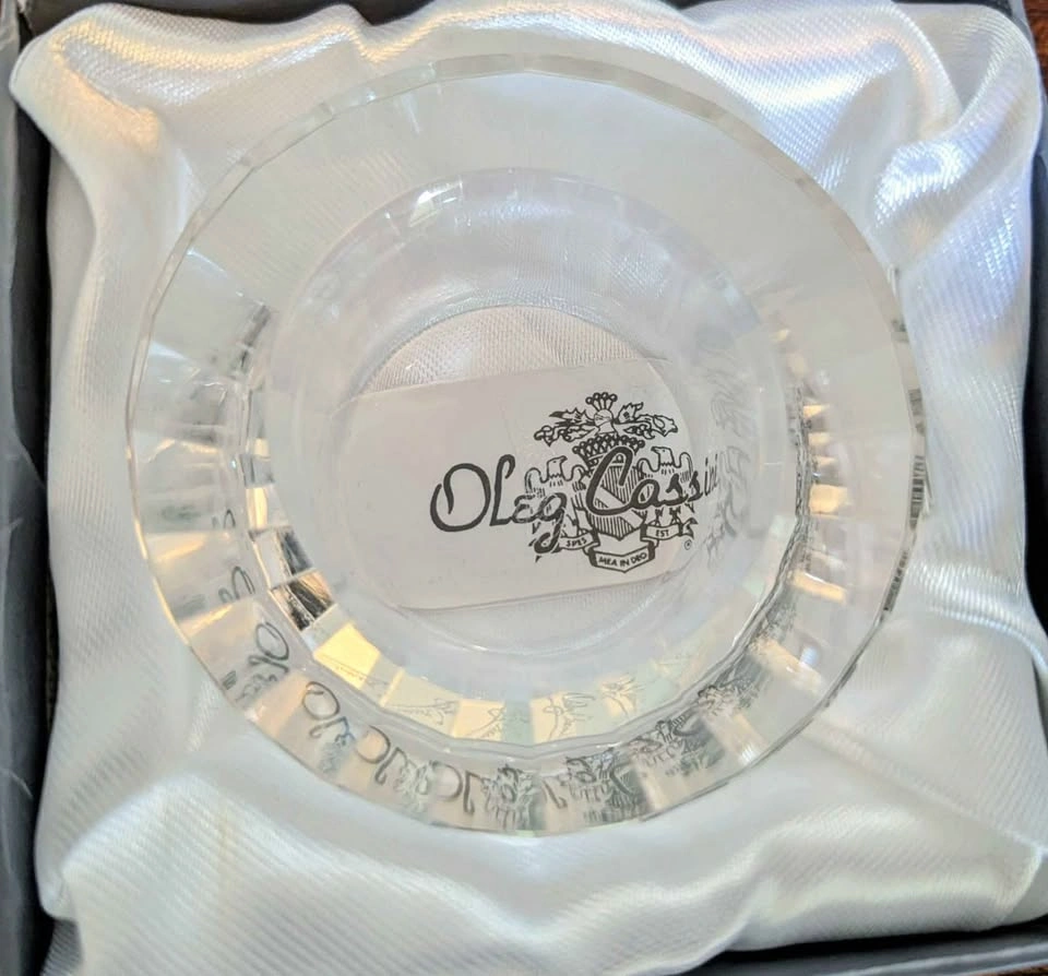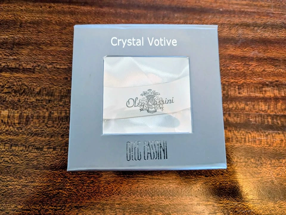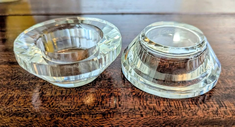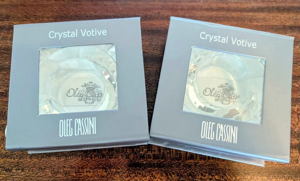 Beautiful set of two Oleg Cassini Crystal Votive Candle Holders in the popular Phoenix style. Brand: Oleg Cassini. Style: Phoenix (model 125041). Material: High-quality faceted crystal. Features: Brilliant light reflection, signed by Oleg Cassini on the base, perfect for votive candles or tea lights. Condition: New in box / No chips or cracks! Diameter: 7 cm. Height: 2.8 cm.