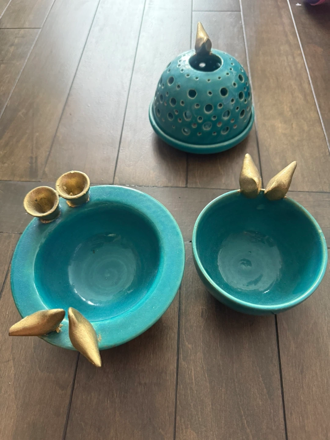 Selling a set of three teal ceramic bowls, each uniquely accented with little gold birds. They're in great shape and would add a cute, whimsical touch to any room!