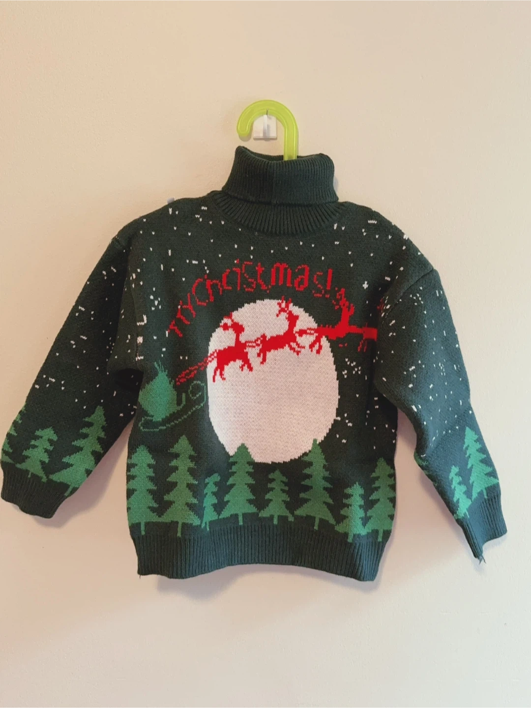Festive green Christmas sweater featuring a fun design with trees and reindeer! Perfect for keeping your little one cozy and stylish during the holiday season. Toddler size 4-5T