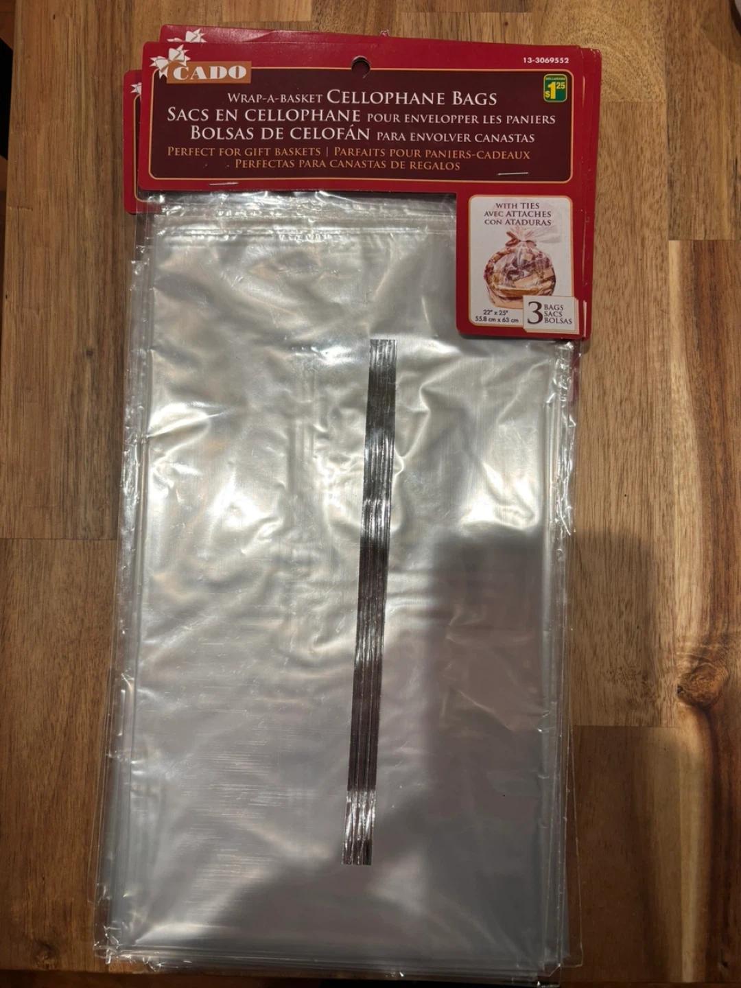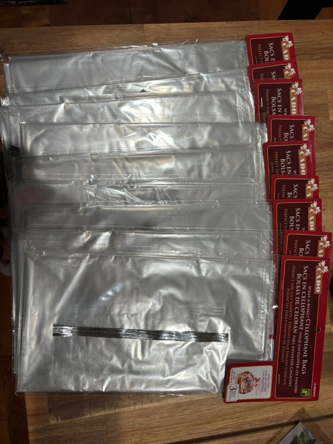 I'm selling CADO Wrap-A-Basket Cellophane Bags (27 count)! Perfect for gift baskets or wrapping up presents. Each package contains 3 bags and comes with ties. They are perfect for wrapping gift baskets
