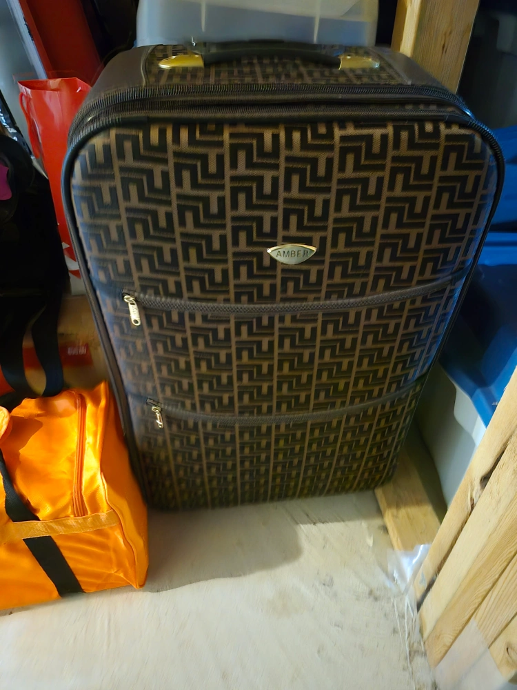Selling an Amber suitcase with a unique brown patterned design. It's in good condition and ready for your next trip!