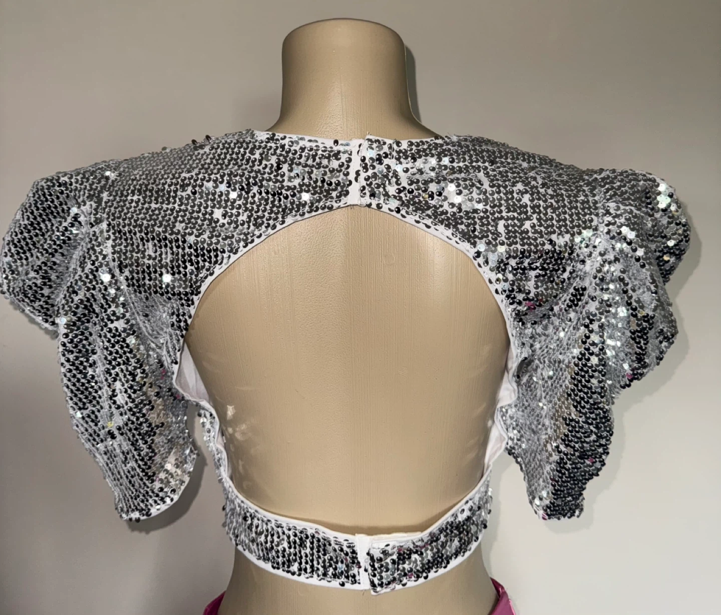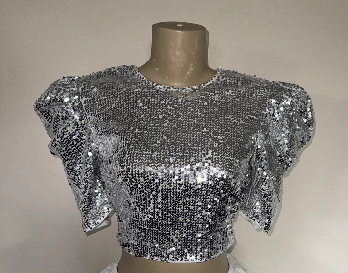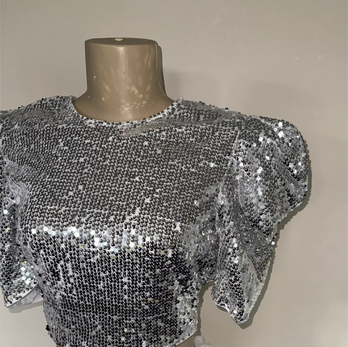 Here's a sparkly sequin crop top! It's silver and perfect for a night out or a fun event. The top has short, puffy sleeves and an open back.