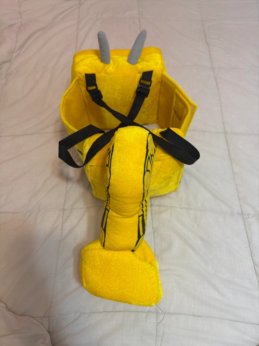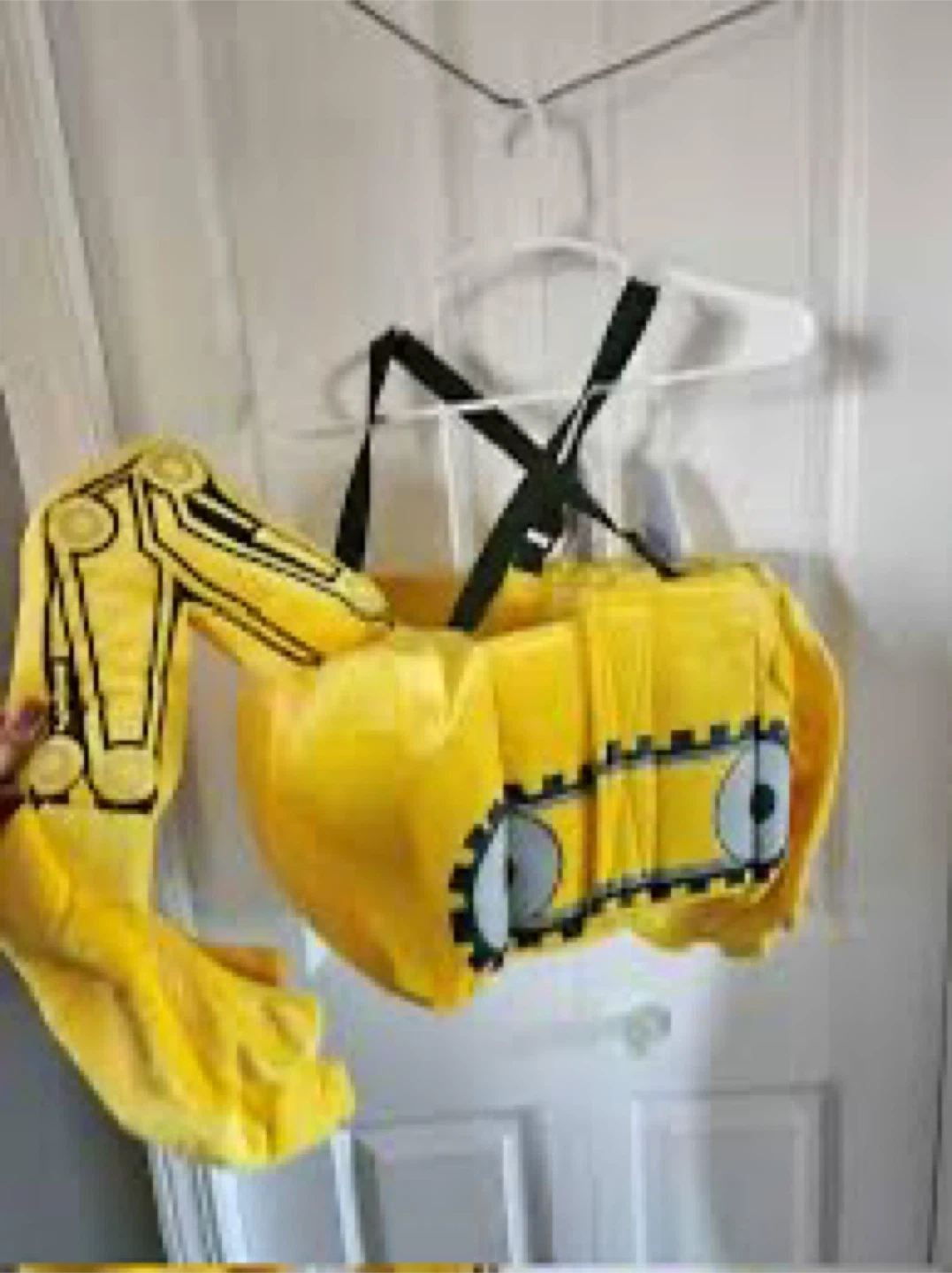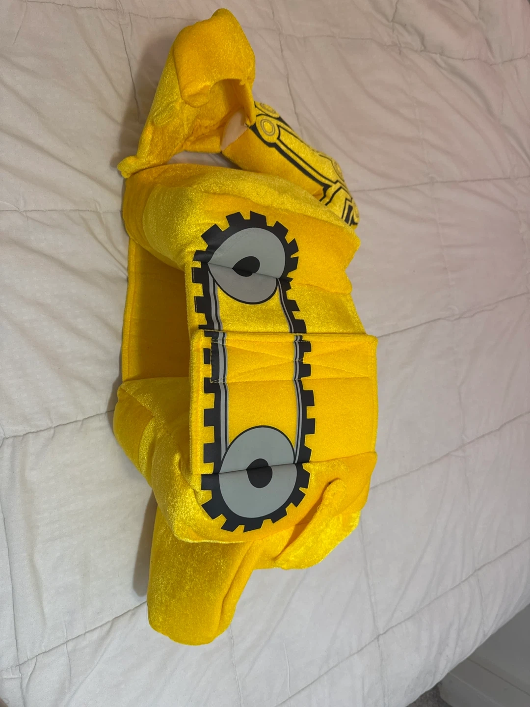 This adorable 'I Want To Be' excavator costume is perfect for dress-up or Halloween. It's in great condition. It is described as a bulldozer truck costume.