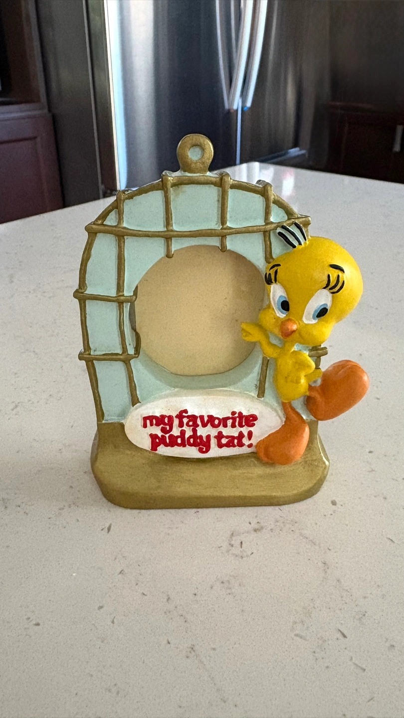 A cute Tweety Bird picture frame featuring the phrase 'My Favorite Puddytat'! It's in great condition and ready to hold your favourite photo. 3.5” x 3”