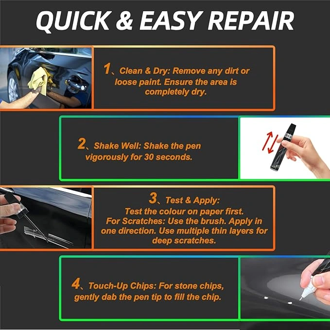 Pick up at 40 Lavery Trail Scarborough. Never been used! Touch up those small scratches and chips on your car with this handy repair pen! It's in Pure Black and designed for quick and easy application. The pen works great for small chips, and the brush covers larger dings. Make your car look like new again!