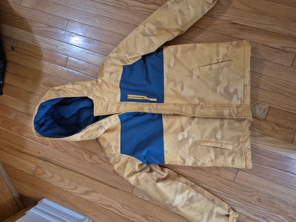 Here's a warm winter jacket with a cool camouflage and blue design! It's perfect for staying cozy during the colder months. It is in great condition and ready for a new home. Size 14 / 16