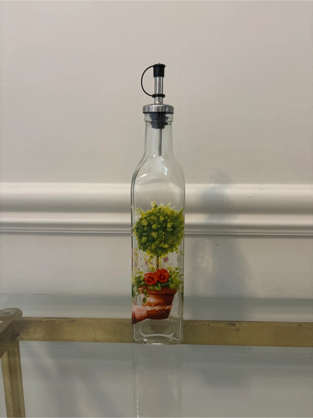 Add a touch of elegance to your kitchen with this lovely olive oil dispenser bottle! It features a charming design with a tree and flowers, perfect for adding a bit of style to your cooking routine. With pourable spout.