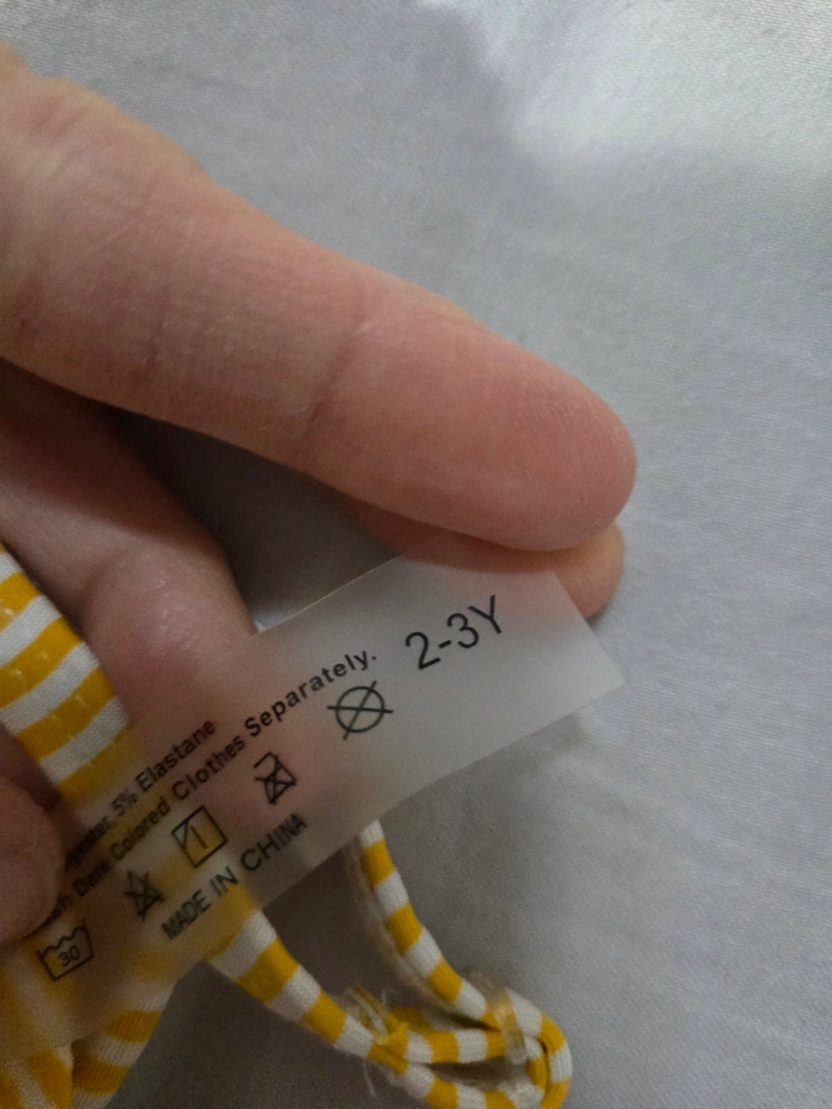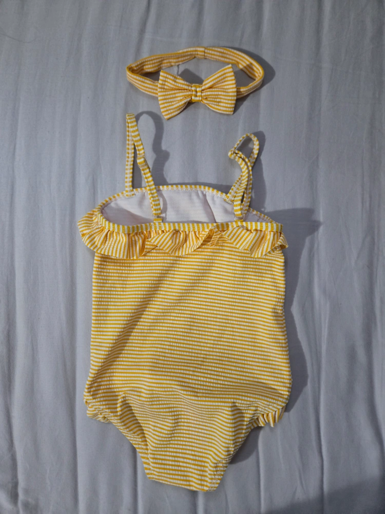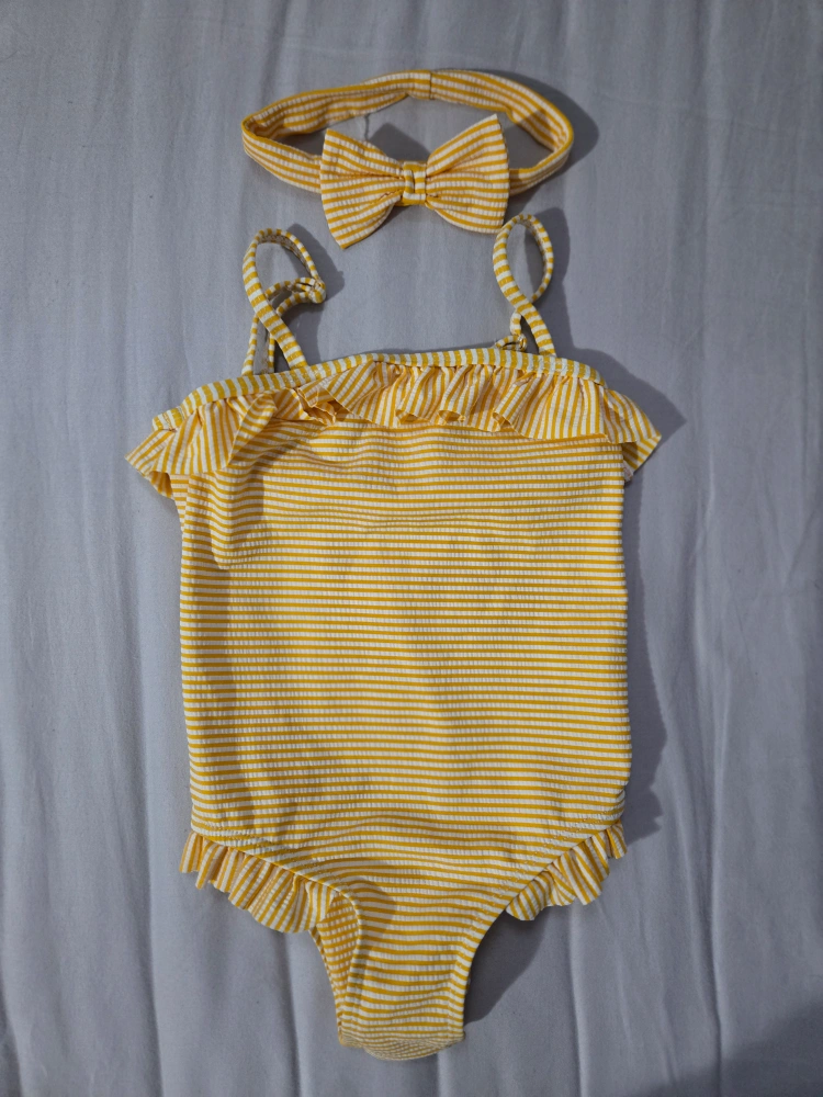 A cute yellow and white striped swimsuit with a matching bow headband! The size is 2-3Y and it's in great condition. Perfect for your little one's summer adventures!