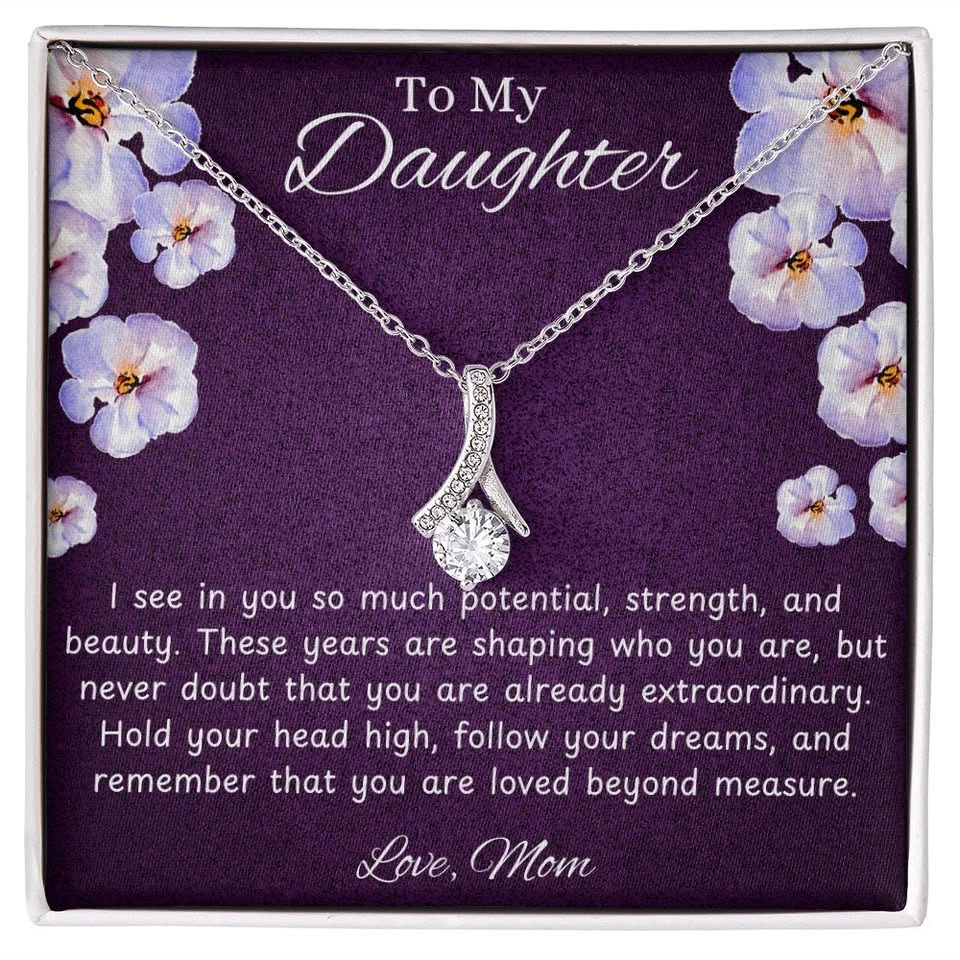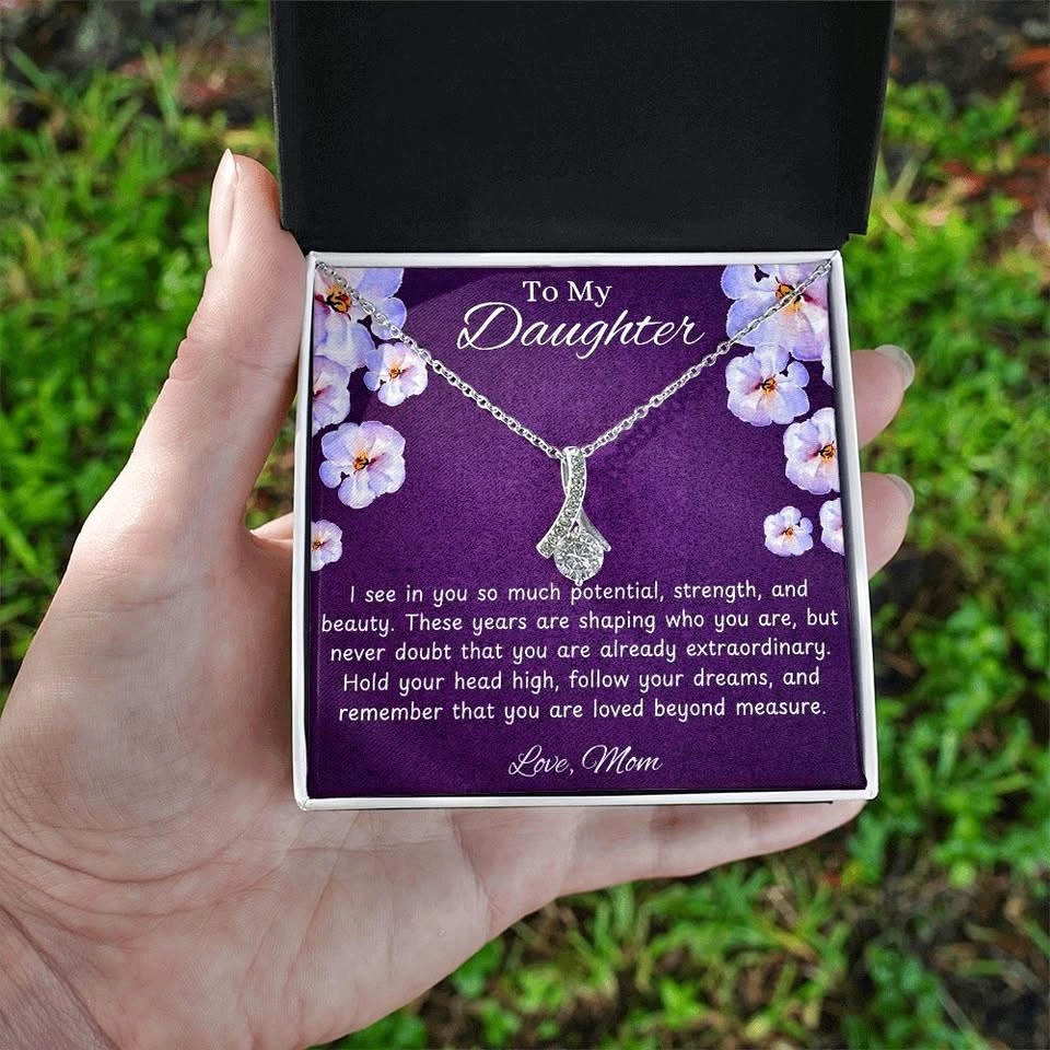 Crafted with an eye for elegance, the "To My Dauhgter I see in you so much potential - Alluring Beauty Necklace" is a stunning addition to any jewelry collection. This necklace features a charming pendant adorned with a sleek design that captures light and attention, suspended on a complementary chain that sits gracefully on the collarbone. Reflecting the essence of beauty in its theme, this piece is a true testament to the allure that can enhance any outfit. Whether it's a casual gathering or a special occasion, this necklace from the SO brand is sure to be a conversation starter, making it the perfect gift for your daughter or a treasured keepsake for yourself.