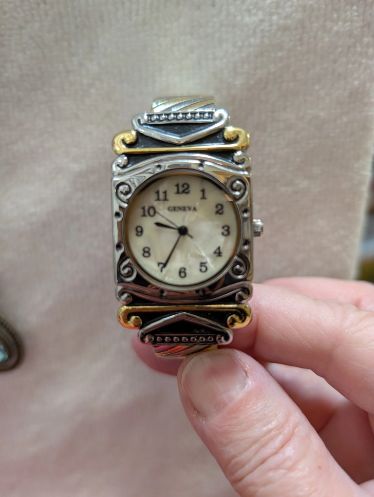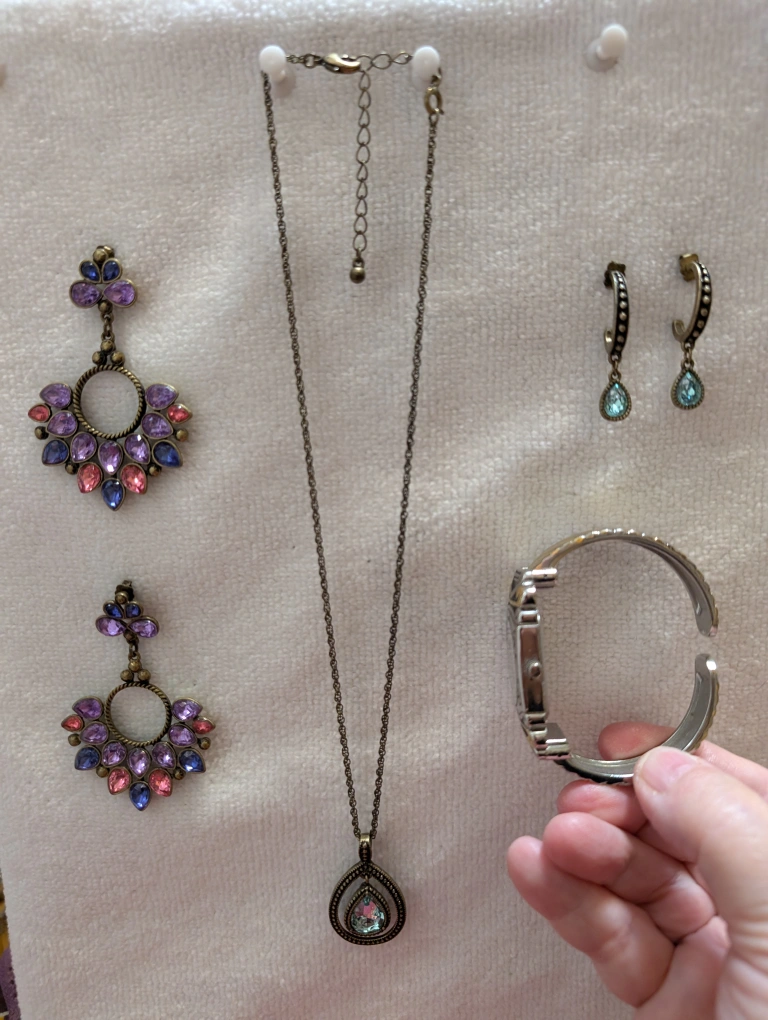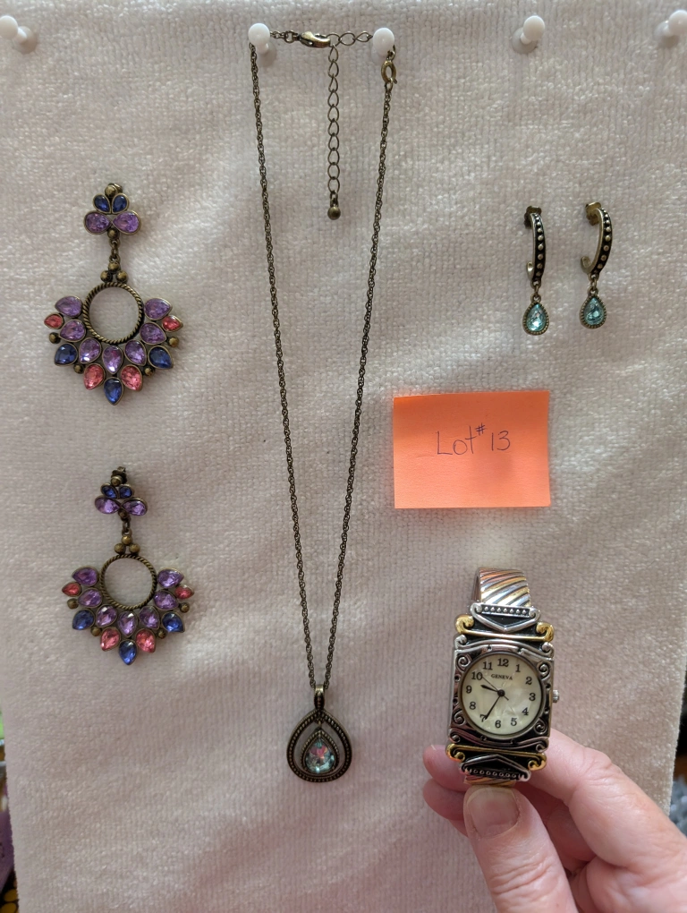 Fashion/Costume Jewellery. Selling a jewelry set including a matching pair of earrings & necklace, bold purple/mauve/pink earrings and a watch. The earrings and necklace set feature a teardrop design with an aquamarine blue stone. The other pair of earrings are bold and colourful. The watch is gold/black/silver and branded Geneva. It is a bracelet watch and will need a new battery. All in great used condition. Lot #13 All for $5 Pick up ONLY in Beltline neighbourhood (near corner of 15 Ave SW and 14 St SW). FCFS. Cash only. I'm flexible with pick up times but please don't no-show. Also please check out my other listings. Thanks.