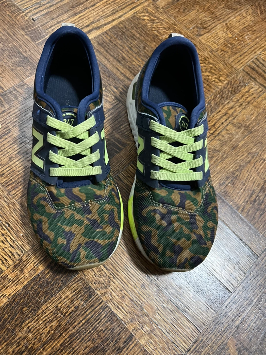 Selling a pair of New Balance 247 sneakers in a cool camo pattern! They feature a navy blue accent and bright green laces. These are in great condition and ready for a new home