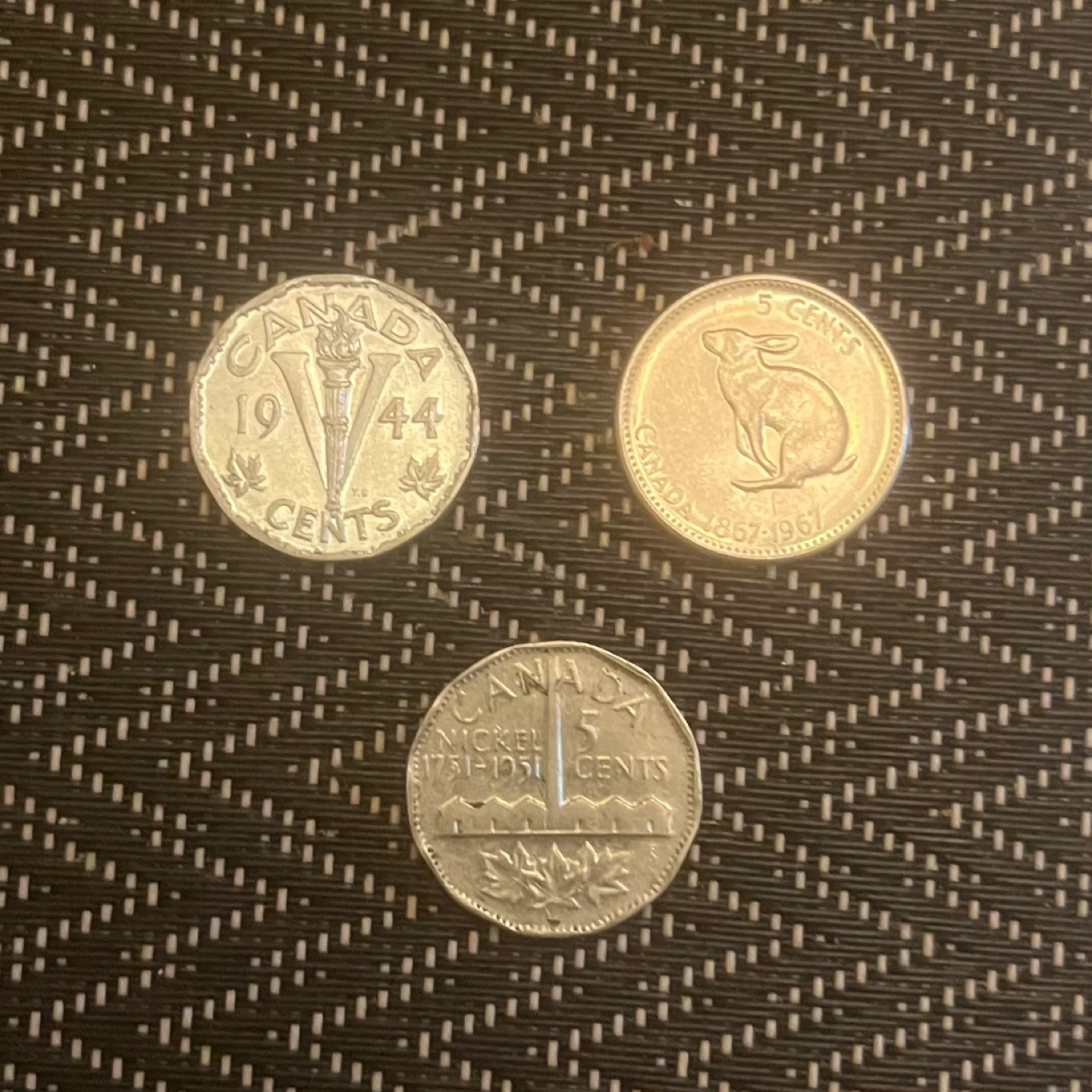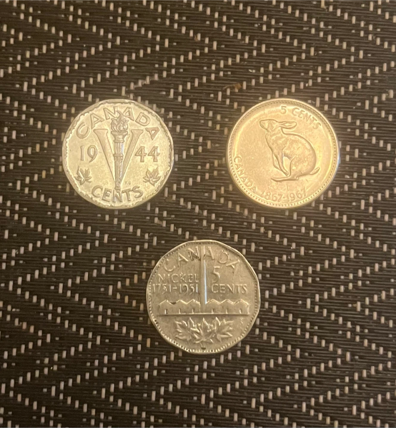 Four dollars each WW-2 coins and 100 years Selling a few vintage Canadian coins. They include a 1944 5-cent coin, a 1867-1967 5-cent coin with a rabbit, and other coins with portraits of King George and Queen Elizabeth