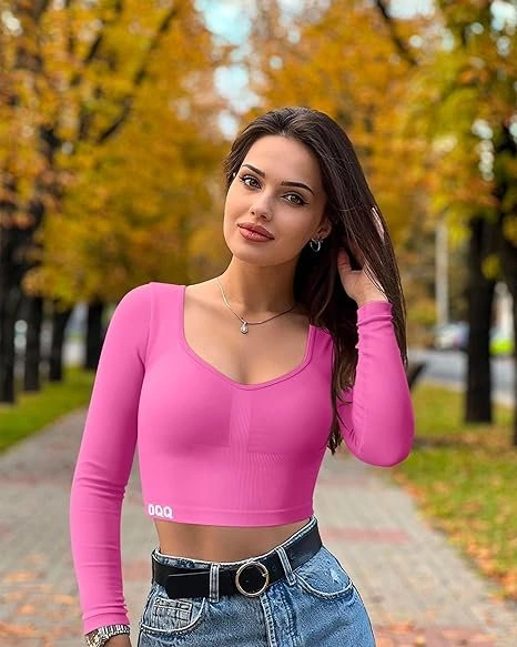 SIZE L : OQQ Women 2 Piece Crop Tops Long Sleeve Stretch Fitted Under scrubs Layer Tee Shirts Exercise Tops Black Rose