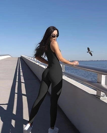 90%Nylon+10% Spandex. Ribbed high neck tank tops jumpsuits. Ribbed Yoga Jumpsuits, flattering half high collar sleeveless leggings, made with soft fabric. High elasticity, Comfortable, Breathable, The 4-way stretch to promote both compression and butt lifting. Elastic material, figure hugging easy to fit any body figure and you will feel close but free/relaxed under this jumpsuits, slim design will show your perfect curves. REFL2110-MB2