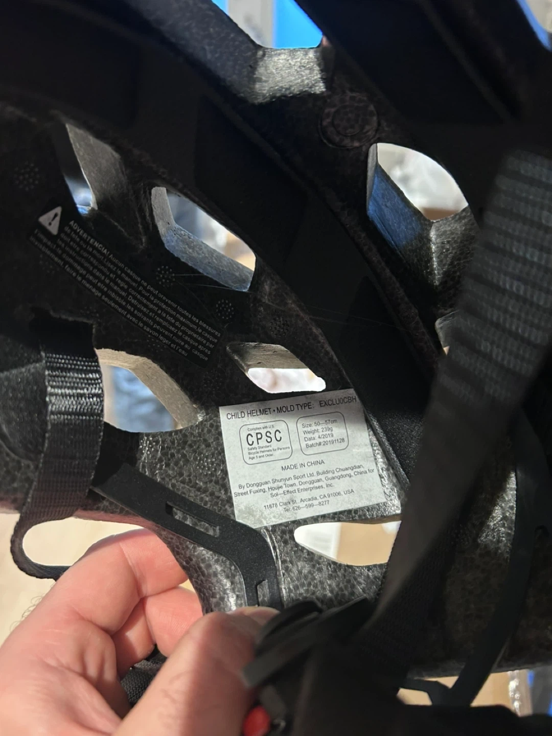 Free child's helmet by Exclusky! The size is 50-57cm. It's white with a fun pattern. The helmet is made with 100% polyurethane foam.
