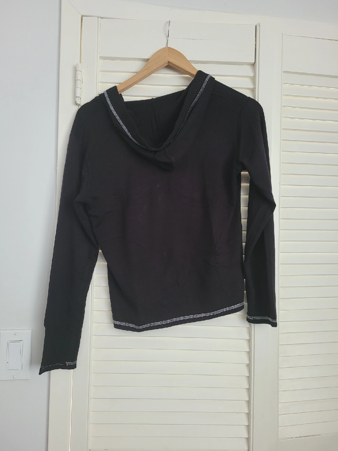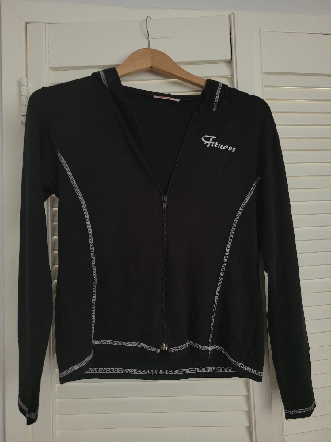 Fitness Black Zip-Up Hoodie size small Selling a black zip-up hoodie with white stitching. It has 'Fitness' written on the front. Perfect for workouts or casual wear!