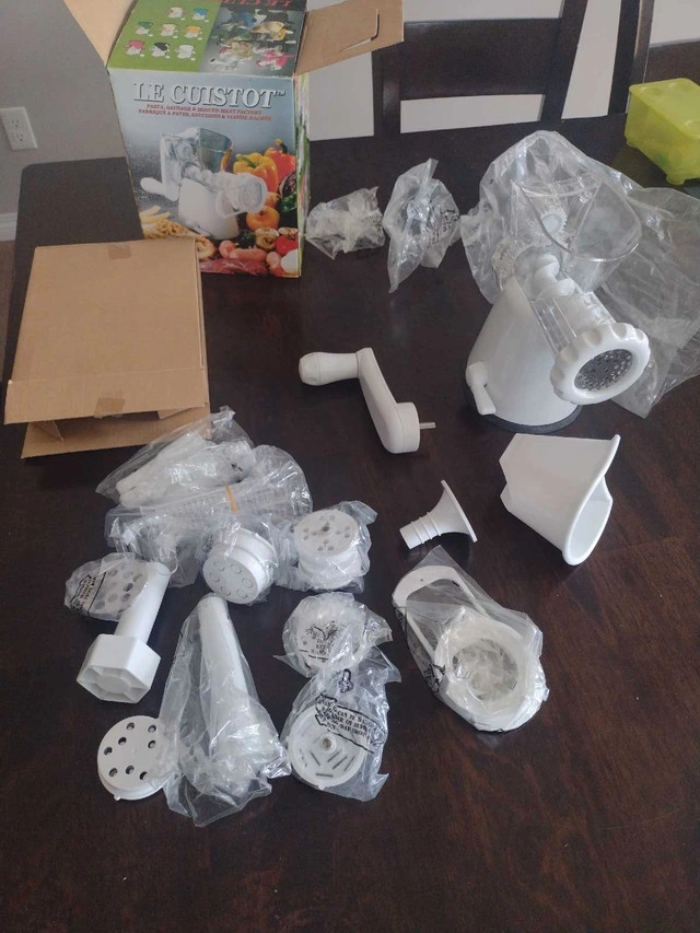 Create delicious homemade pasta, sausages, and minced meat with this Le Cuistot Pasta, Sausage & Minced Meat Factory! This versatile kitchen tool is in like-new condition, ready to help you craft culinary delights. It includes the original box, with a variety of attachments to make various types of pasta and sausages. * Versatile kitchen tool * Includes multiple attachments * Easy to use and clean Ready to roll out some fun? If you see this ad, the pasta party is still on!