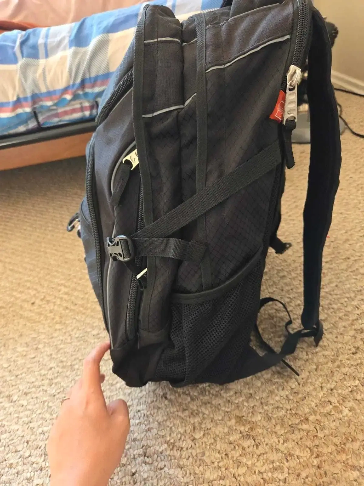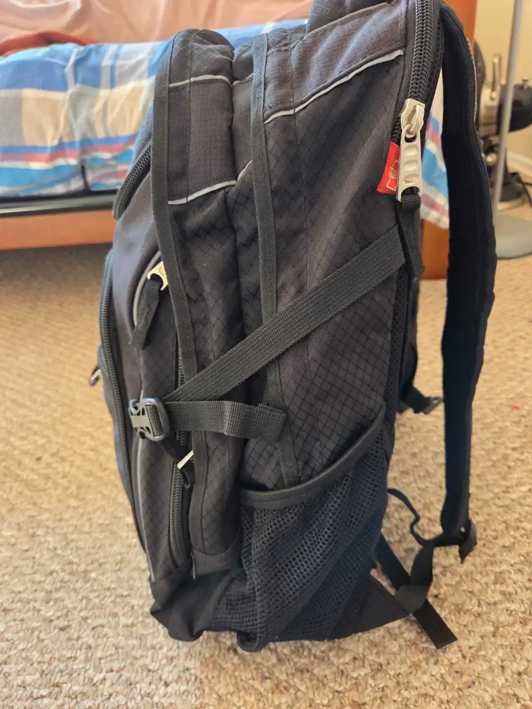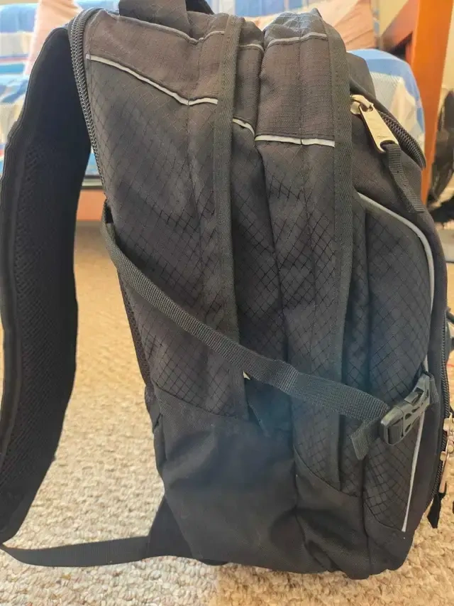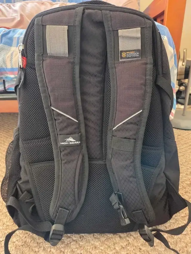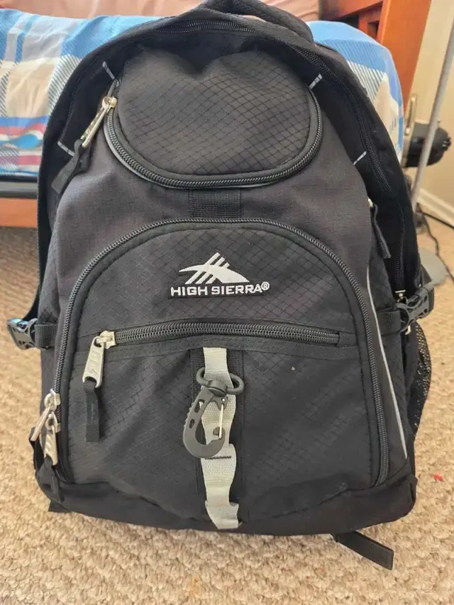This High Sierra backpack is great for school or hiking and comes with a built-in rain/snow cover for added protection! Specifications: * Brand: High Sierra * Colour: Black * Features: Multiple compartments, padded straps, and a rain/snow cover. * Condition: in good condition Looking for a reliable backpack? This one is ready for new adventures!