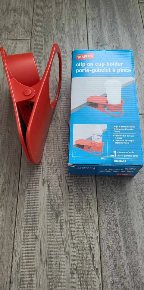 Staples Clip On Cup Holder - Red Keep your desk tidy with this handy Staples clip-on cup holder! It's new and ready to hold your favourite beverage. Clips to desks and tables with a thickness not to exceed 38mm