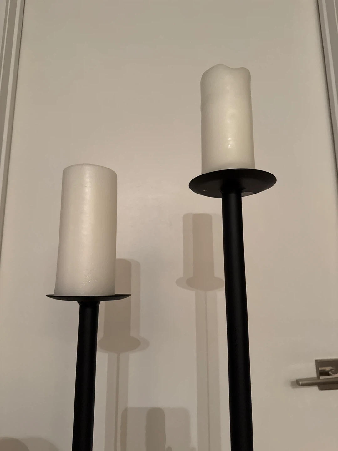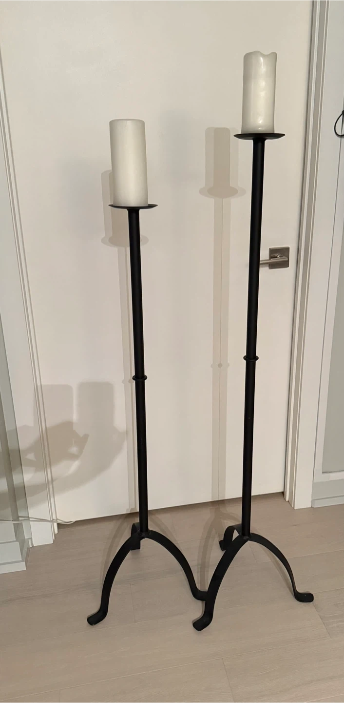 Set of two black wrought iron floor candle holders. They add a touch of elegance to any room. Perfect for creating a cozy atmosphere indoors or outdoors. Heavy and sturdy. Custom made by a Canadian designer. $50 each
