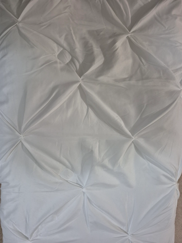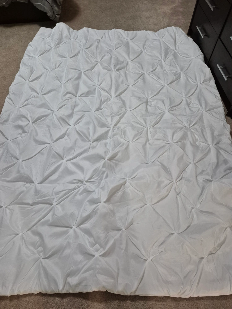 Selling a white comforter with a lovely textured design! It's in great condition and would look perfect in any bedroom. The material is soft and comfortable, making it ideal for a cozy night's sleep. Used only for staging house.