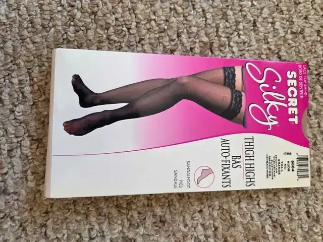 Enhance your silhouette with these Silky Secret 20 denier sandal foot thigh highs featuring a delicate lace top band, perfect for adding a touch of elegance to any outfit! These thigh highs are new in the original packaging, ensuring pristine condition and fit for sizes average to tall. They are just the ticket to making your legs feel longer and more beautiful. * 20 Denier * Sandal Foot * Lace Top Band * Sizes: Average/Tall Don't miss out on this chance to add a little luxury to your wardrobe. Grab them before they're gone!