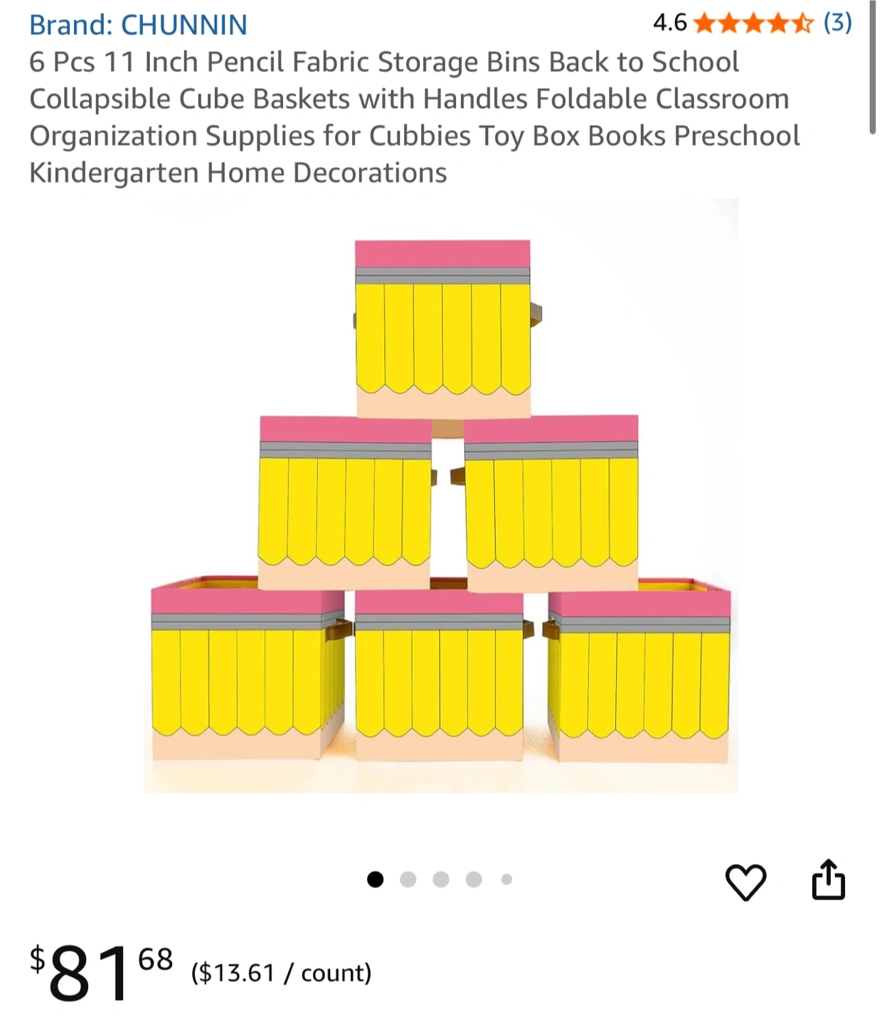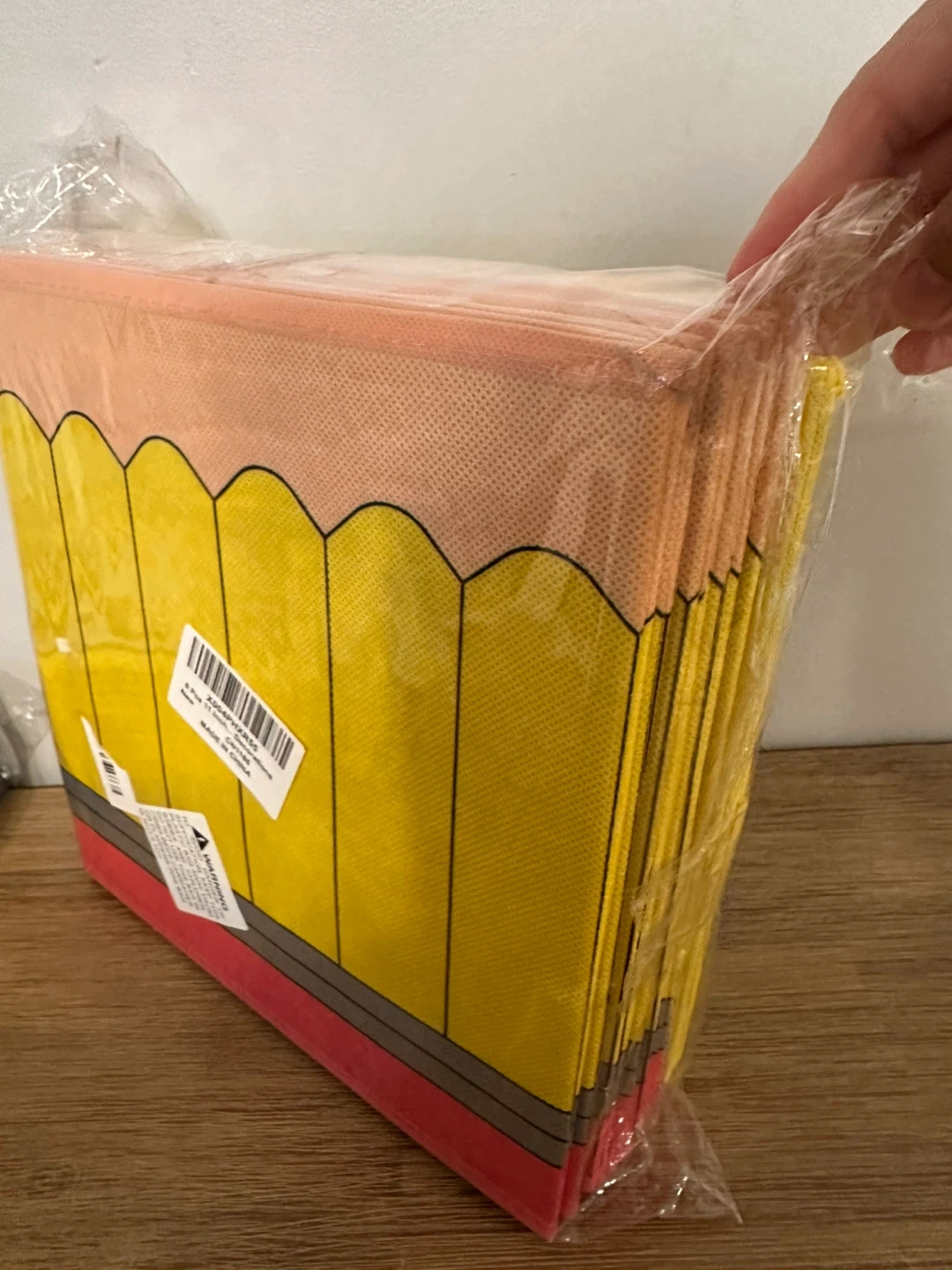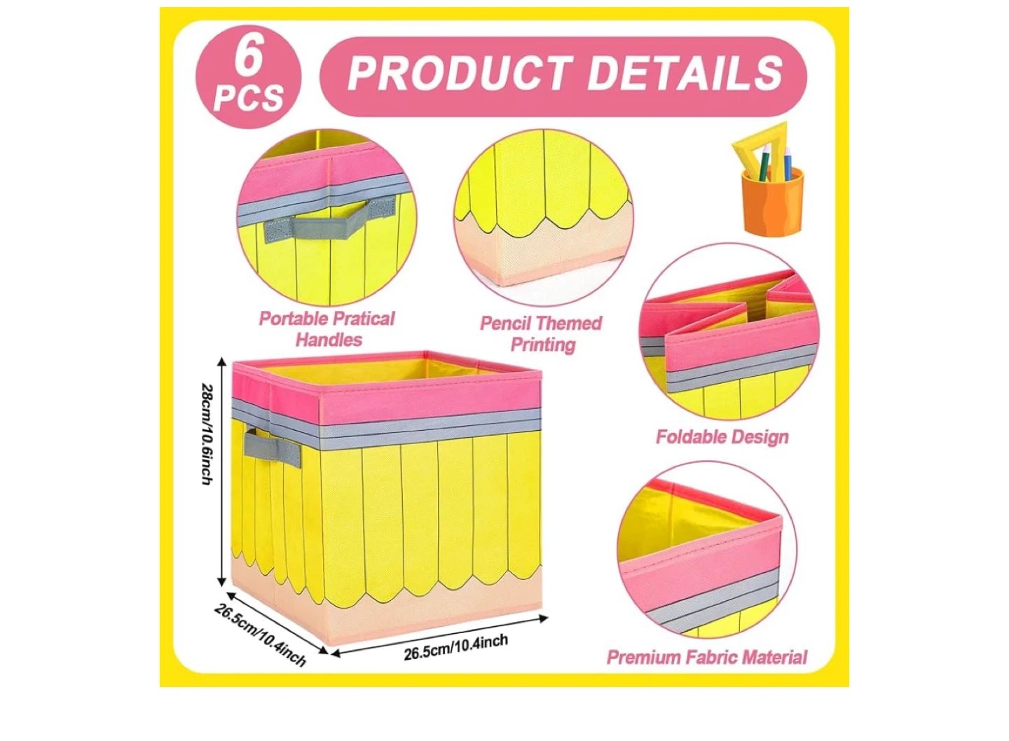 I'm selling a set of 6 brand new CHUNNIN pencil-themed fabric storage bins! These are perfect for organizing toys, books, or classroom supplies. - Foldable design - Portable practical handles - Premium fabric material - Dimensions: 28cm/10.6inch x 26.5cm/10.4inch