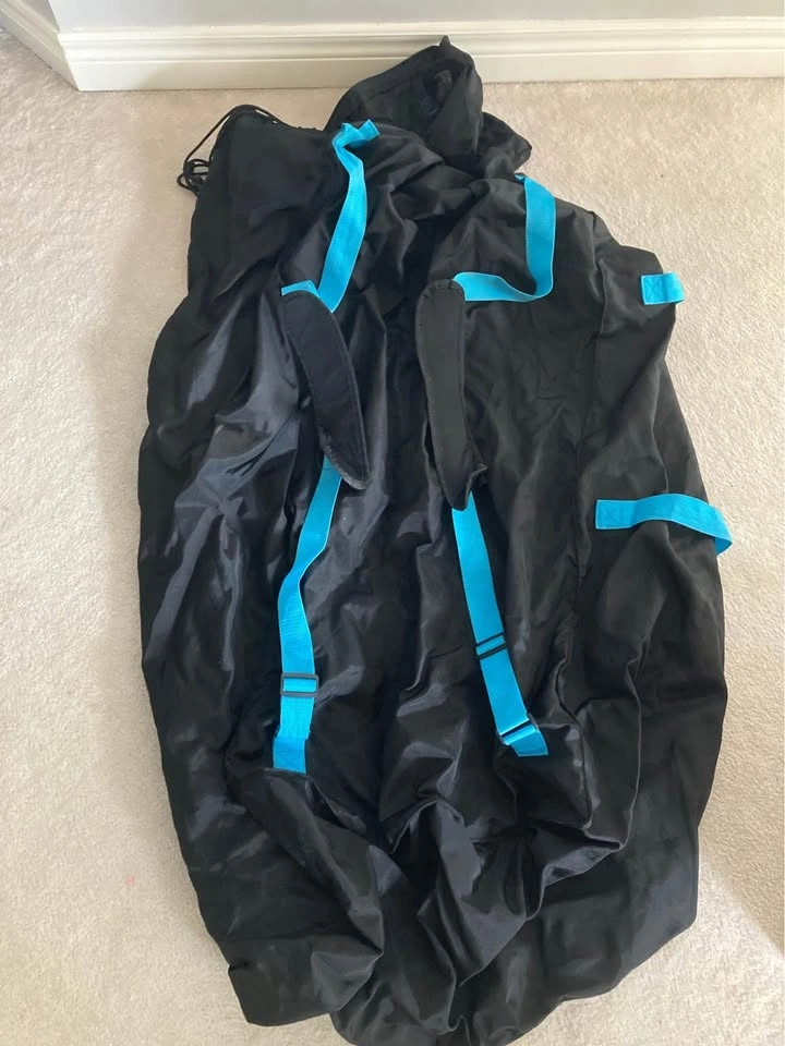 Make airport travel easier with this Zohzo stroller travel bag, designed to keep your stroller clean and protected from dirt, scuffs, and rough handling while on the airplane. Made from tough, water-resistant material with bright blue straps and a clear “Fragile – Handle With Care” warning on the front. Includes a personalized name section (can be covered with white out and replaced with your own child's name). Good condition. Front label is peeling off a bit as per the photo. Has backpack straps. Fit our Uppababy Cruz stroller, but I imagine it would fit most standard strollers. Easy to fold and store when not in use. Has a small bag for the bag when not in use. Perfect for air travel or long-term stroller storage.