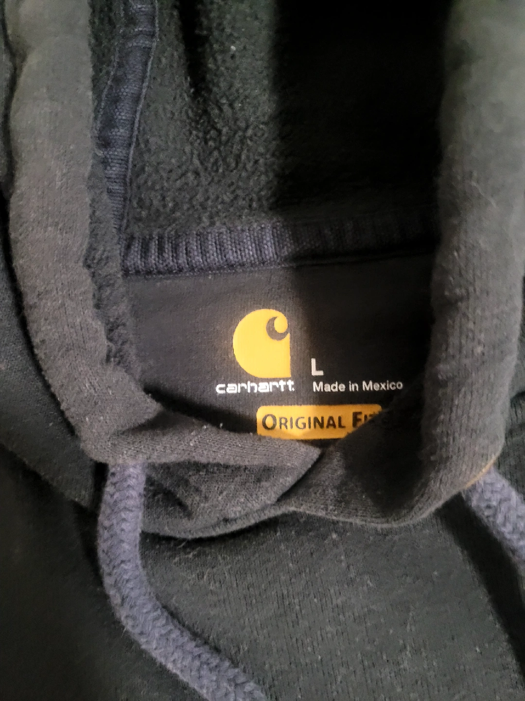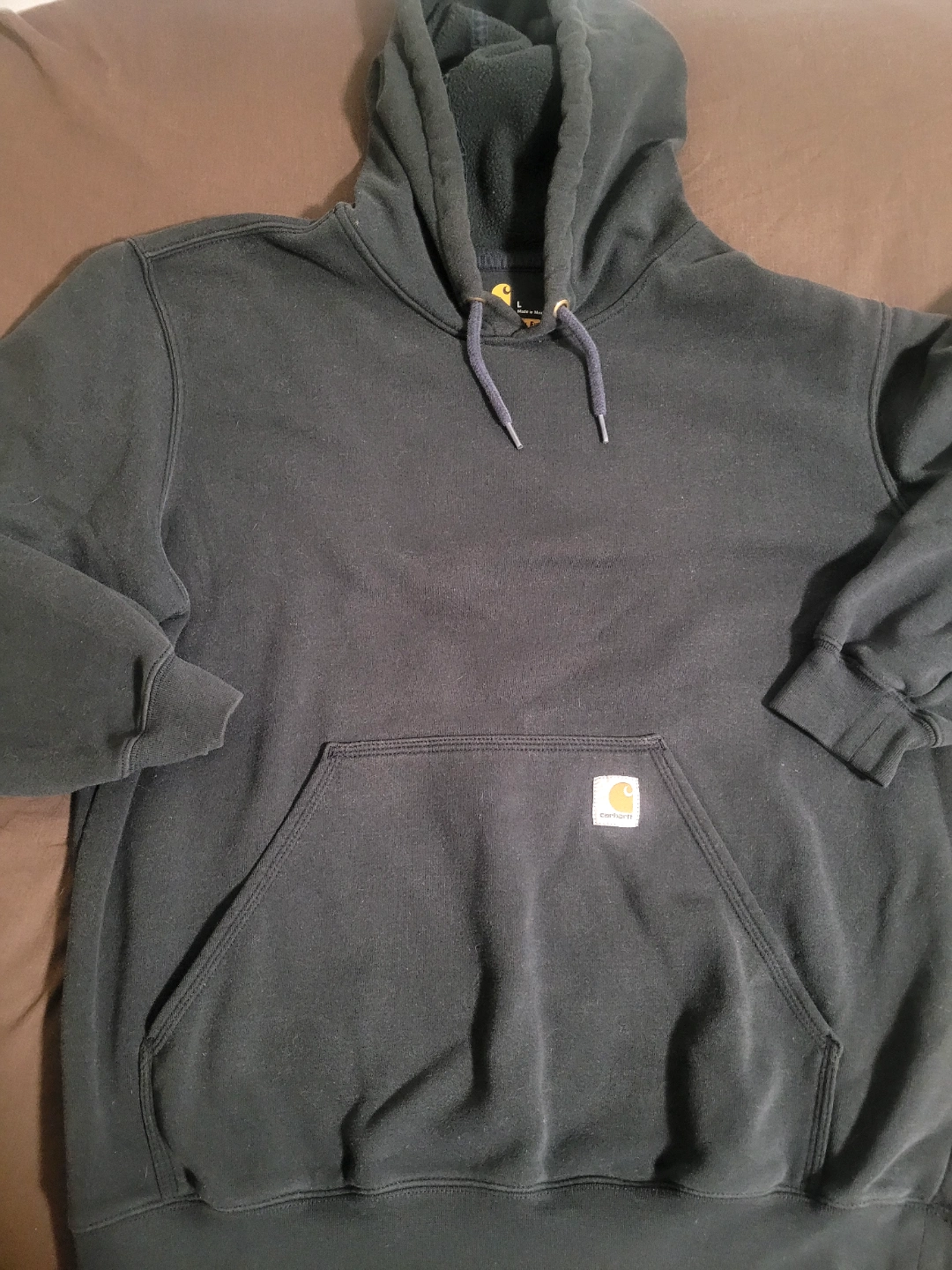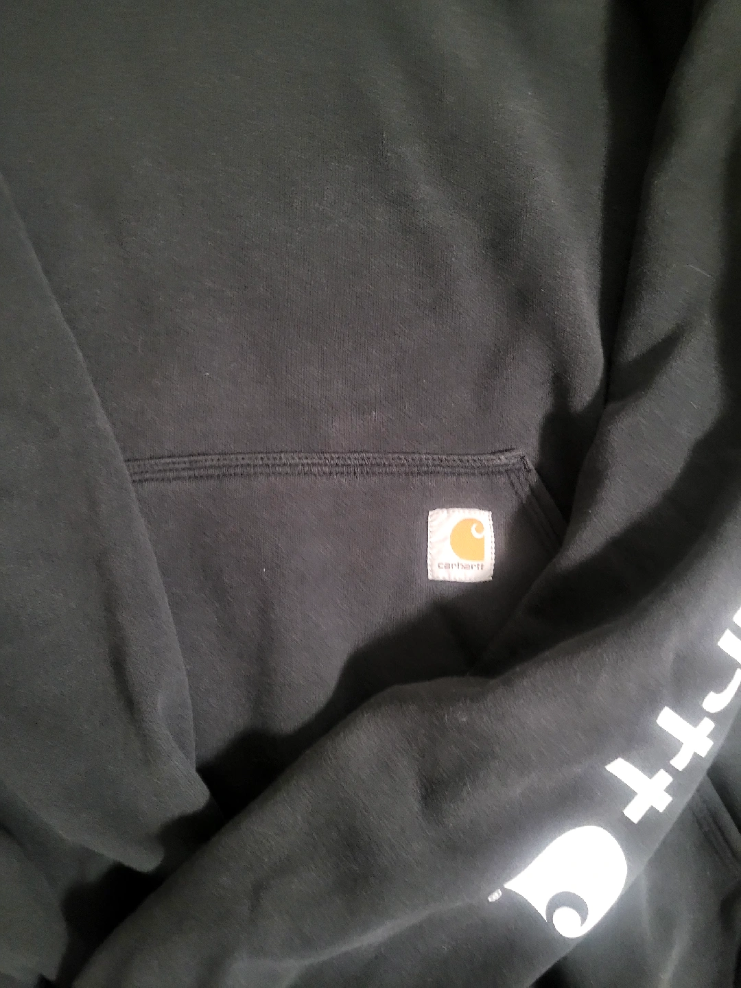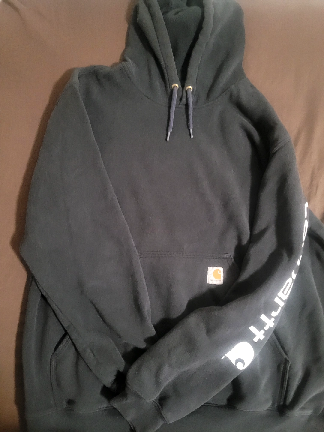 Cozy Carhartt hoodie in black, size large! It features the classic Carhartt logo on the front pocket and down the sleeve. Perfect for staying warm on those chilly days Carhartt hoodie Size L Only worn a couple times size L and bit long bought it at a thrift store in square one called throwback vault for 45 need gone asap looking to get rid of fast pick up only Around shierdan mall and Erin mills pwky Message for more