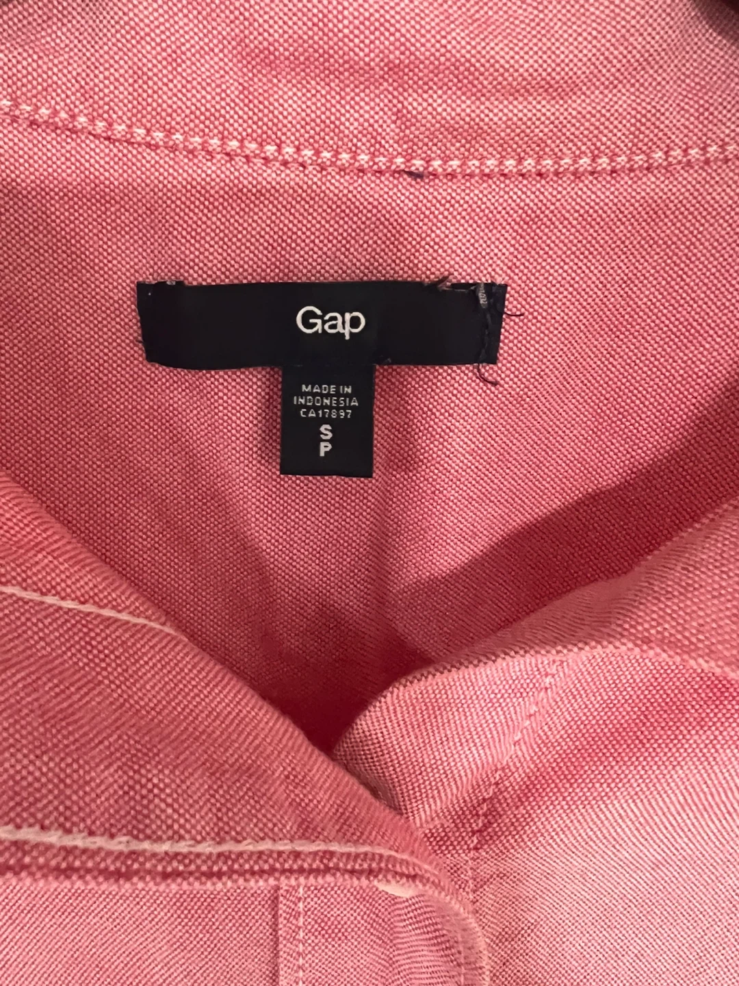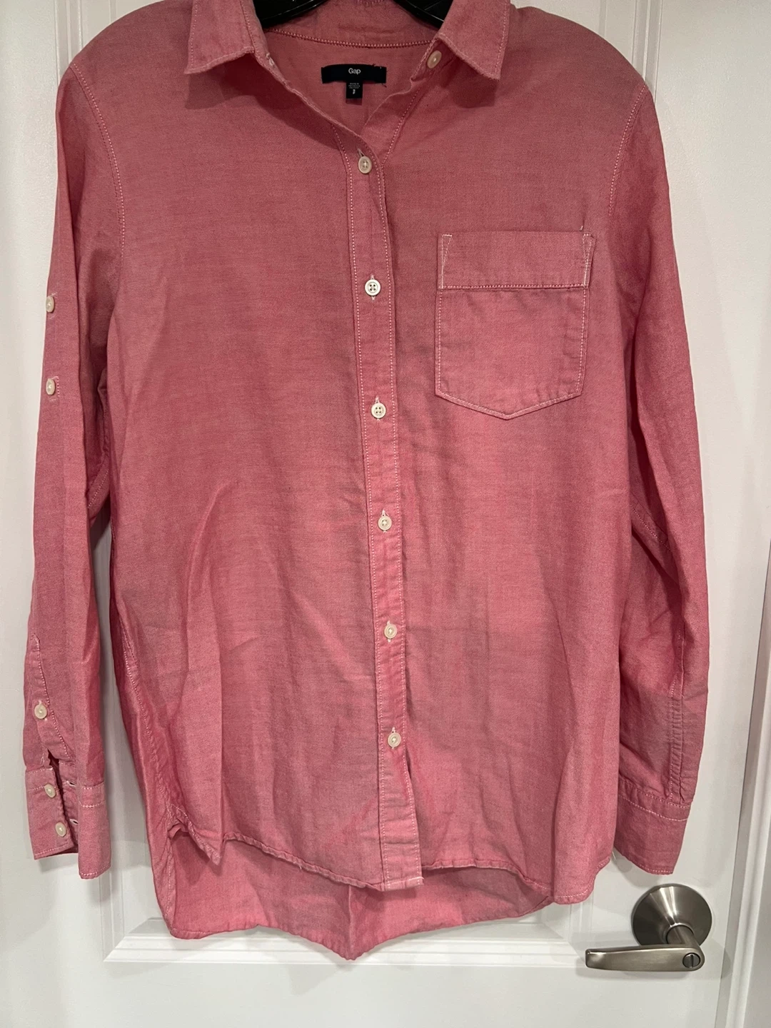 Here's a cute Gap button-up shirt in a lovely shade of pink! It's a size small and in great condition. Perfect for a casual day out or dressing up for a more polished look