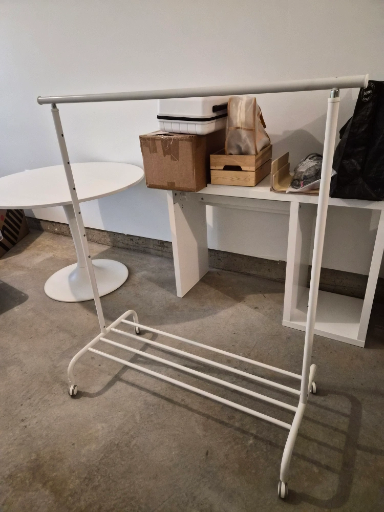 Selling a gently used IKEA Rigga clothes rack in white. It's perfect for adding extra hanging space to your closet or laundry room. It's in great condition and ready for a new home. Retails for $29.99!