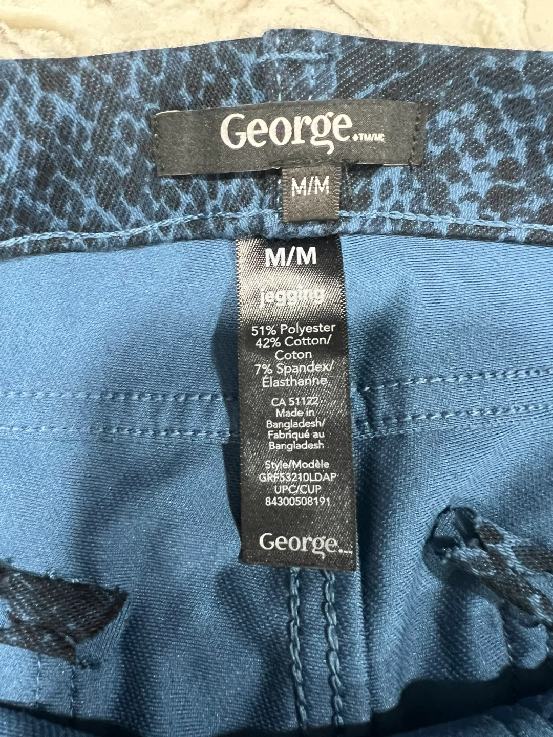 Comfy George leggings in a size medium! They have a cool blue snakeskin print. The material is 51% polyester, 42% cotton, and 7% spandex/elastane