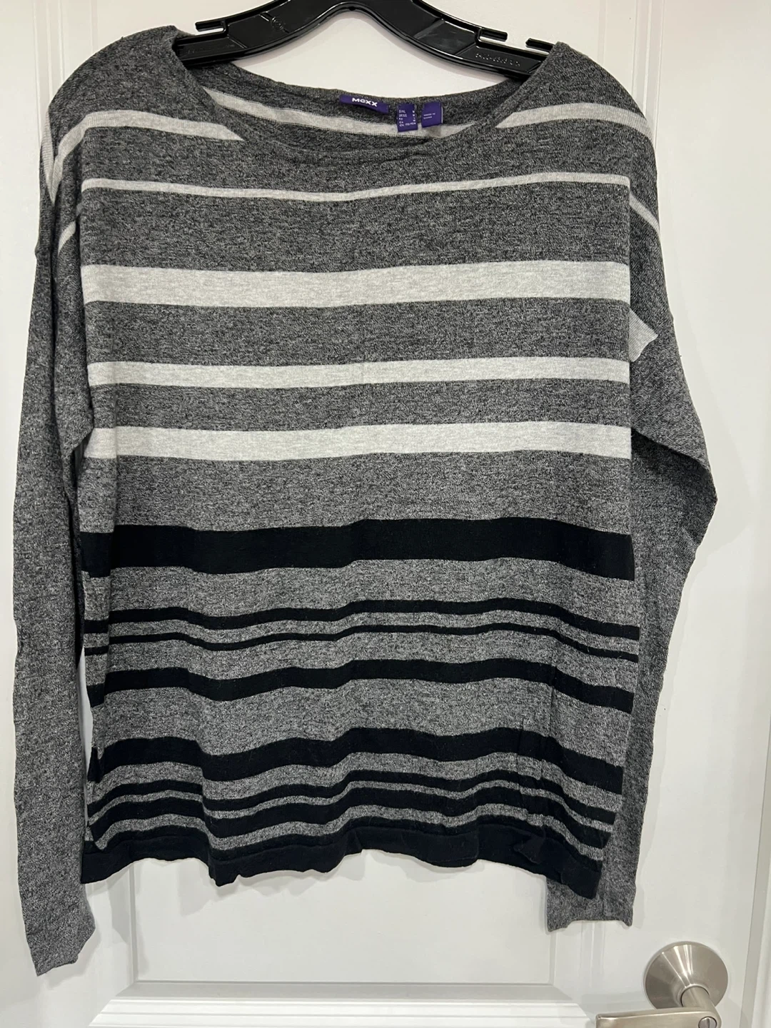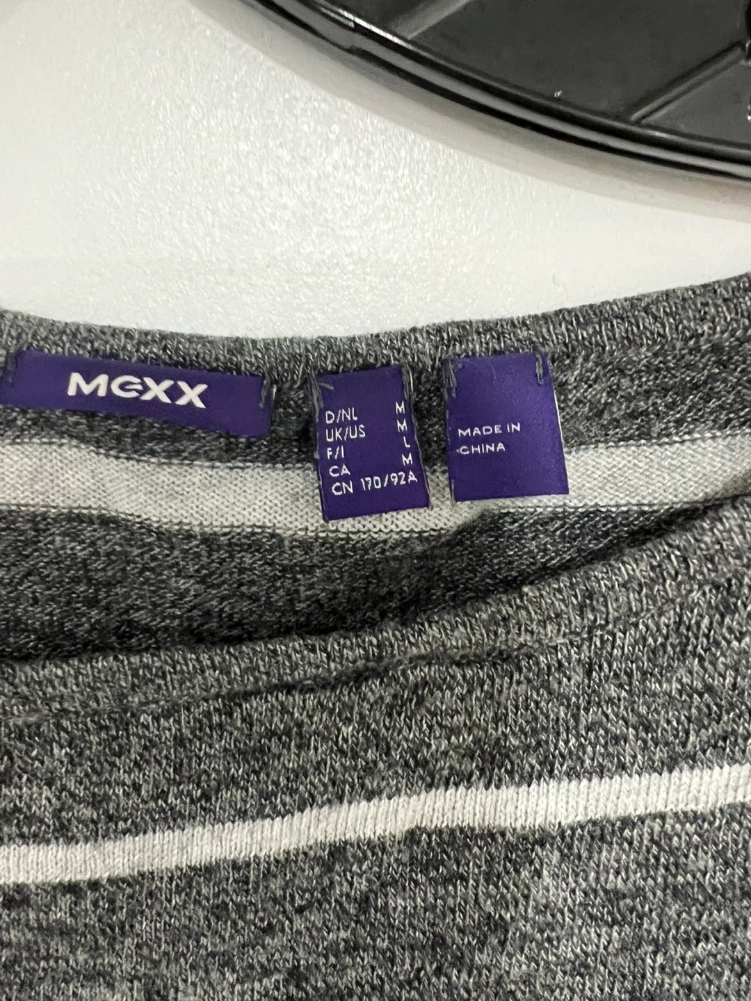 This is a MGXX long-sleeve top in a striped pattern of grey, white, and black. It's a size medium and in great condition. The material is soft and comfortable, perfect for layering or wearing on its own