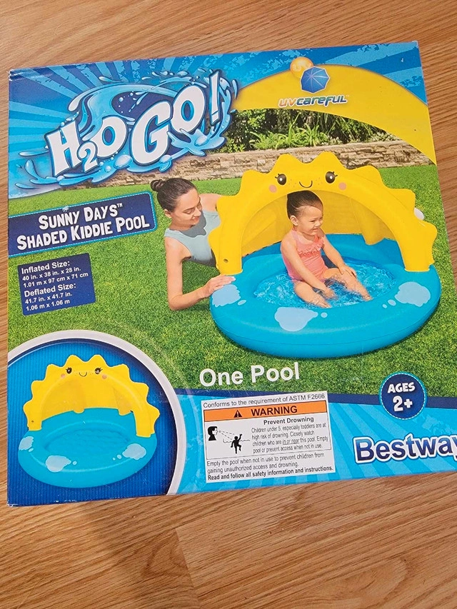 Introducing the H2OGO! Sunny Days Shaded Kiddie Pool, perfect for keeping your little ones cool and protected from the sun during those hot summer days! This brand new, in-box pool features a cute, sun-shaped shade and is designed for ages 2+. Inflated, it measures 40 inches x 38 inches x 28 inches, providing ample space for fun. Specifications: * Inflated Size: 40 in. x 38 in. x 28 in. (1.01 m x 97 cm x 71 cm) * Deflated Size: 41.7 in. x 41.7 in. (1.06 m x 1.06 m) * Built-in sun shade for UV protection * Durable PVC construction * Easy to inflate and deflate. I'm offering it at a great discount! P.S. If the ad is still up, the pool is still available!
