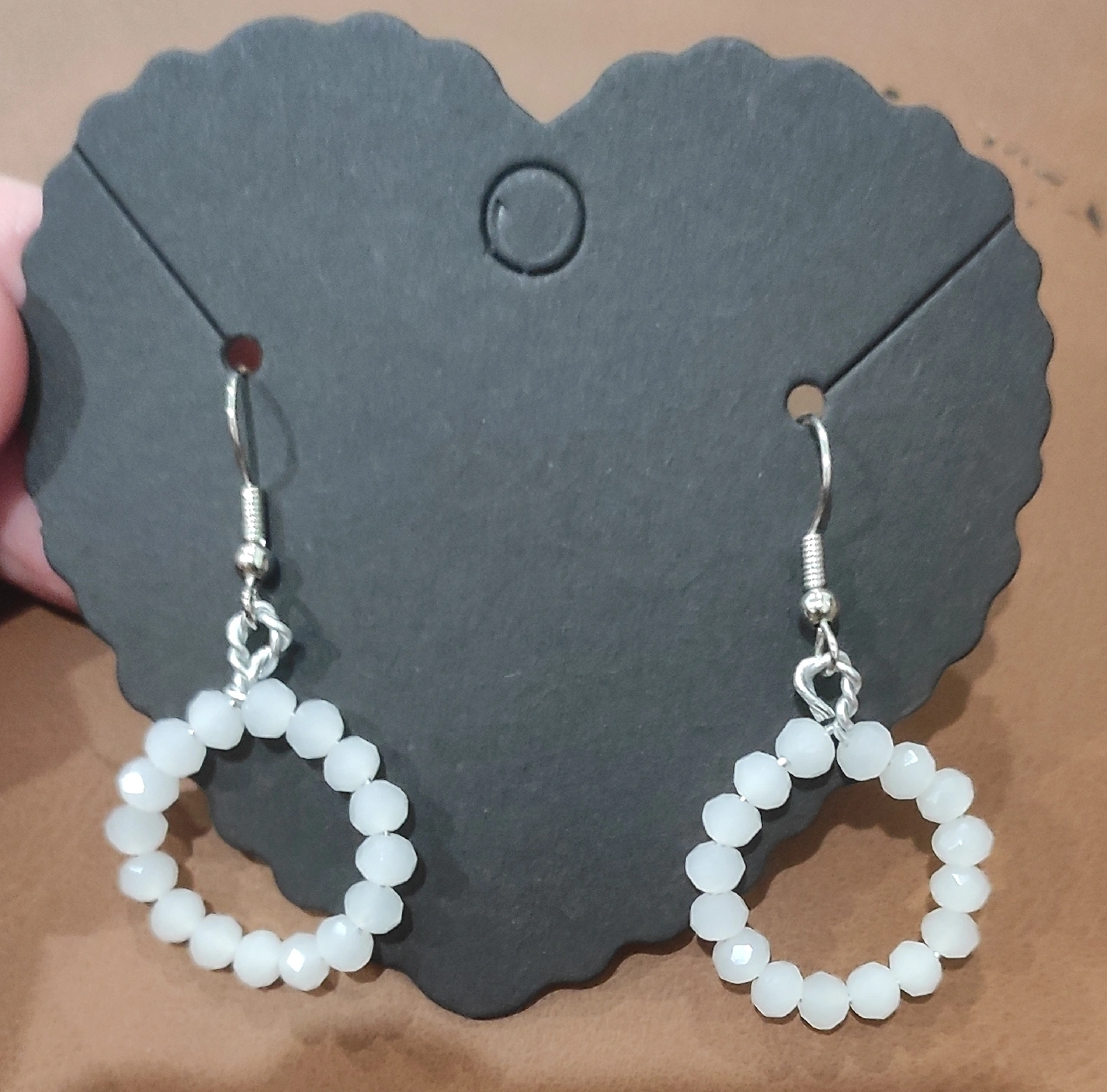 Here are some cute beaded circle dangle earrings. They are white and have a silver hook. Perfect for dressing up or down!