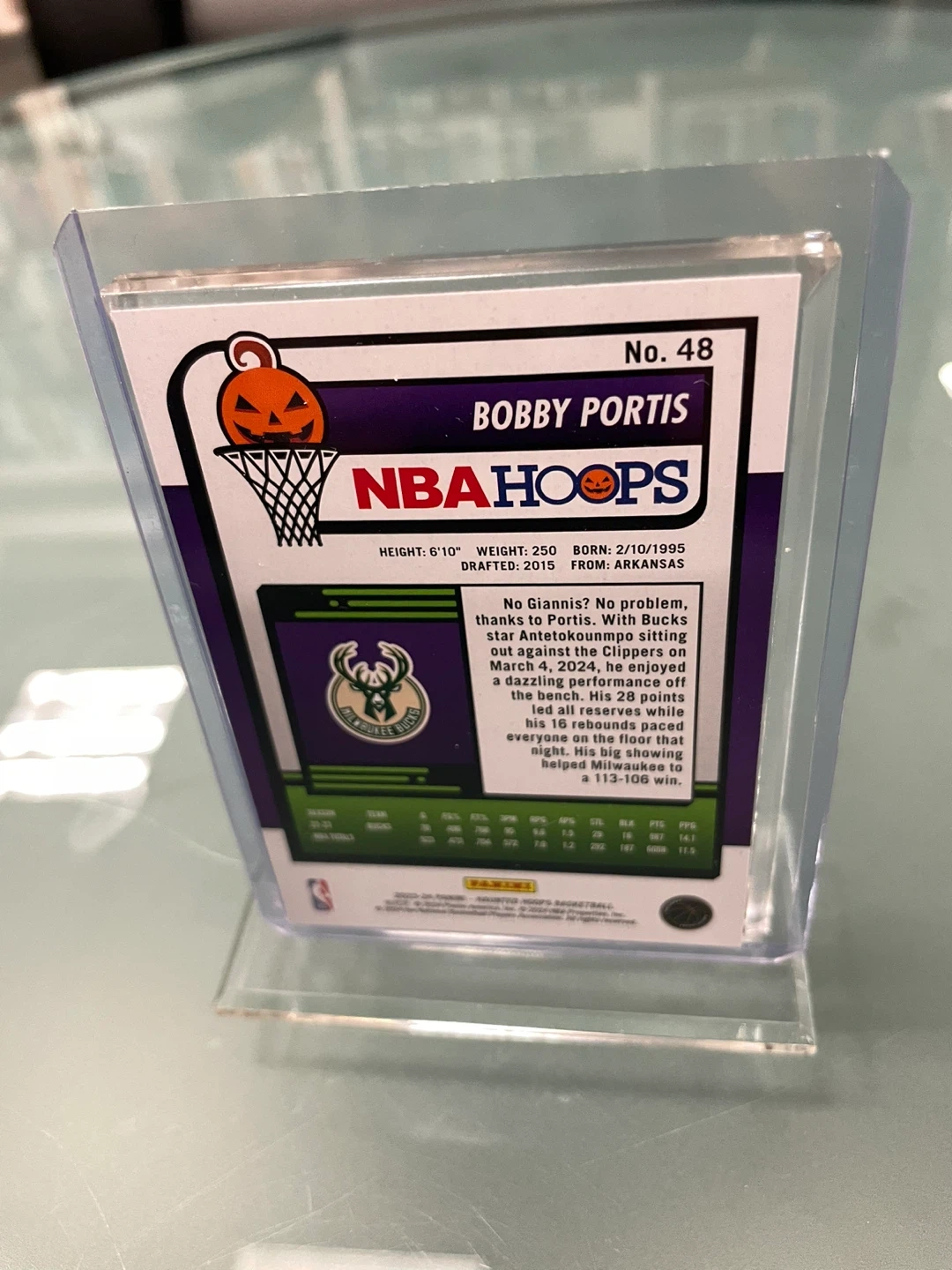 Selling a Bobby Portis NBA Haunted Hoops trading card! It's number 48 in the set. He's 6'10" and weighs 250 lbs. Born on February 10, 1995, and drafted in 2015 from Arkansas