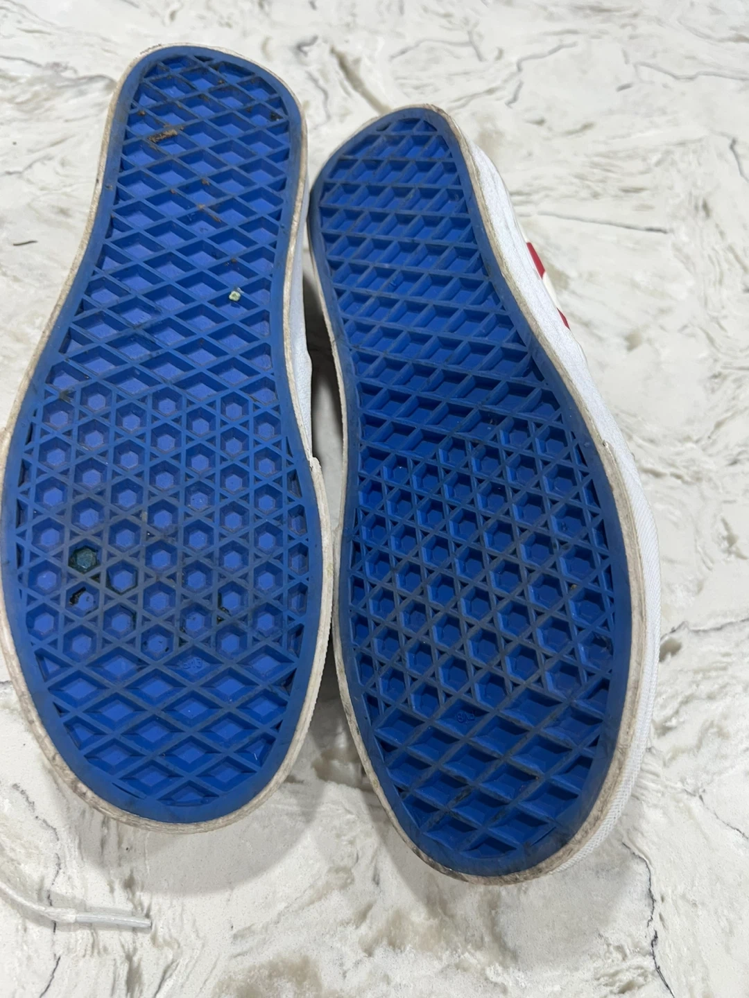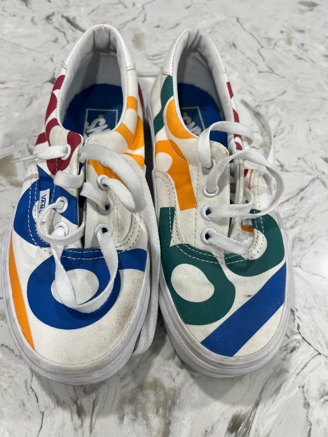 Selling a pair of Vans Era shoes in a fun multi-colour design on a true white background. They're a US women's size 5.5. The soles are blue. They have some signs of wear, but still lots of life left!