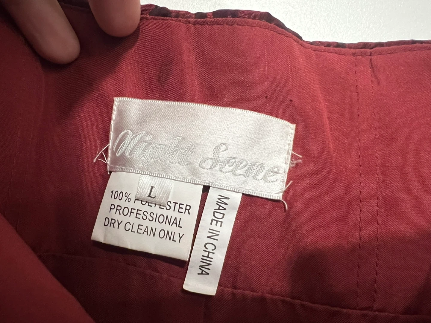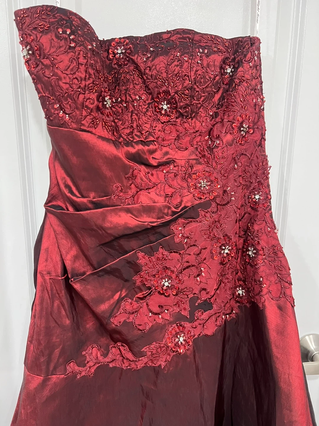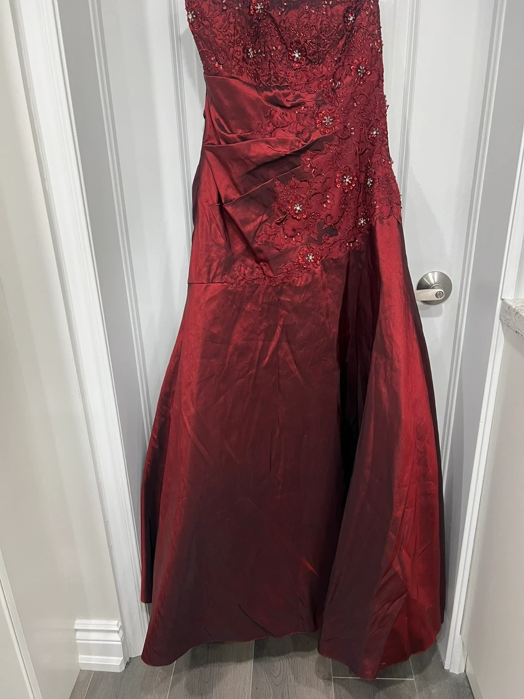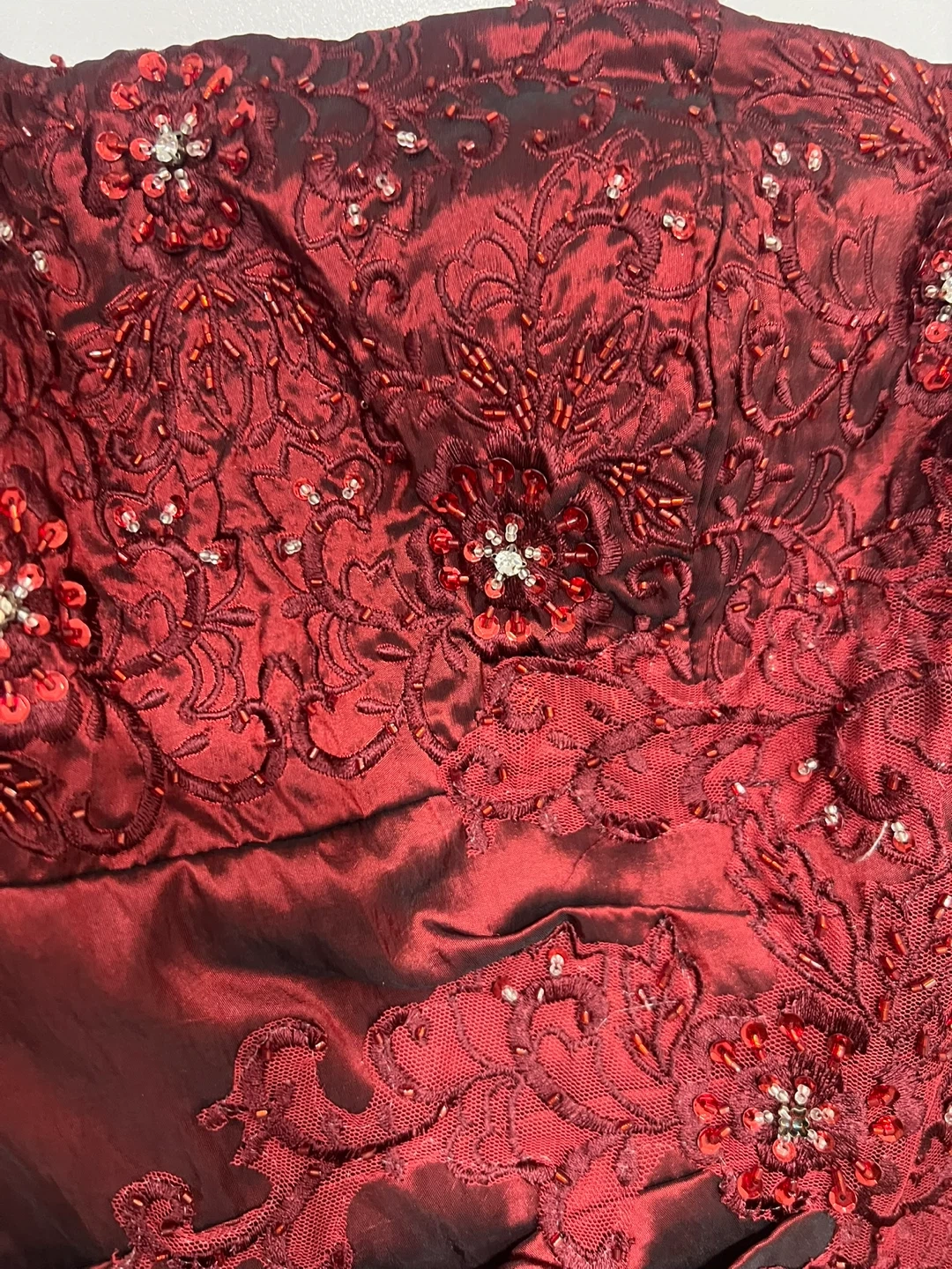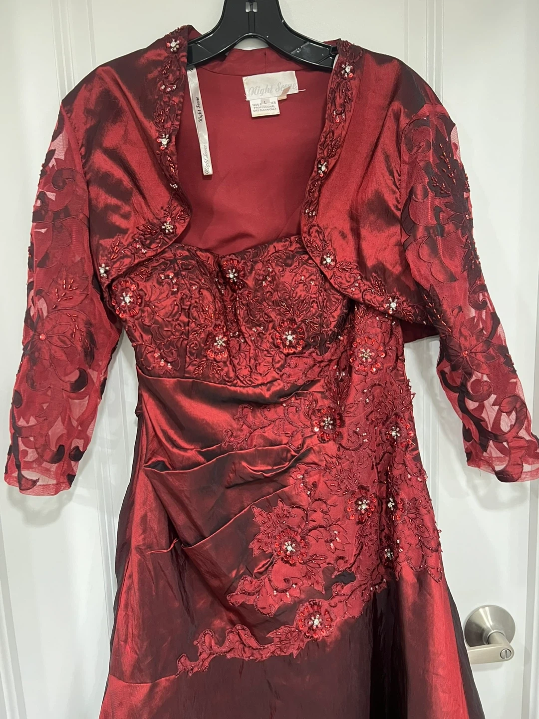 Selling a beautiful burgundy dress from Night Scene, size L. It's made of 100% polyester and features intricate floral detailing. Perfect for a special occasion!