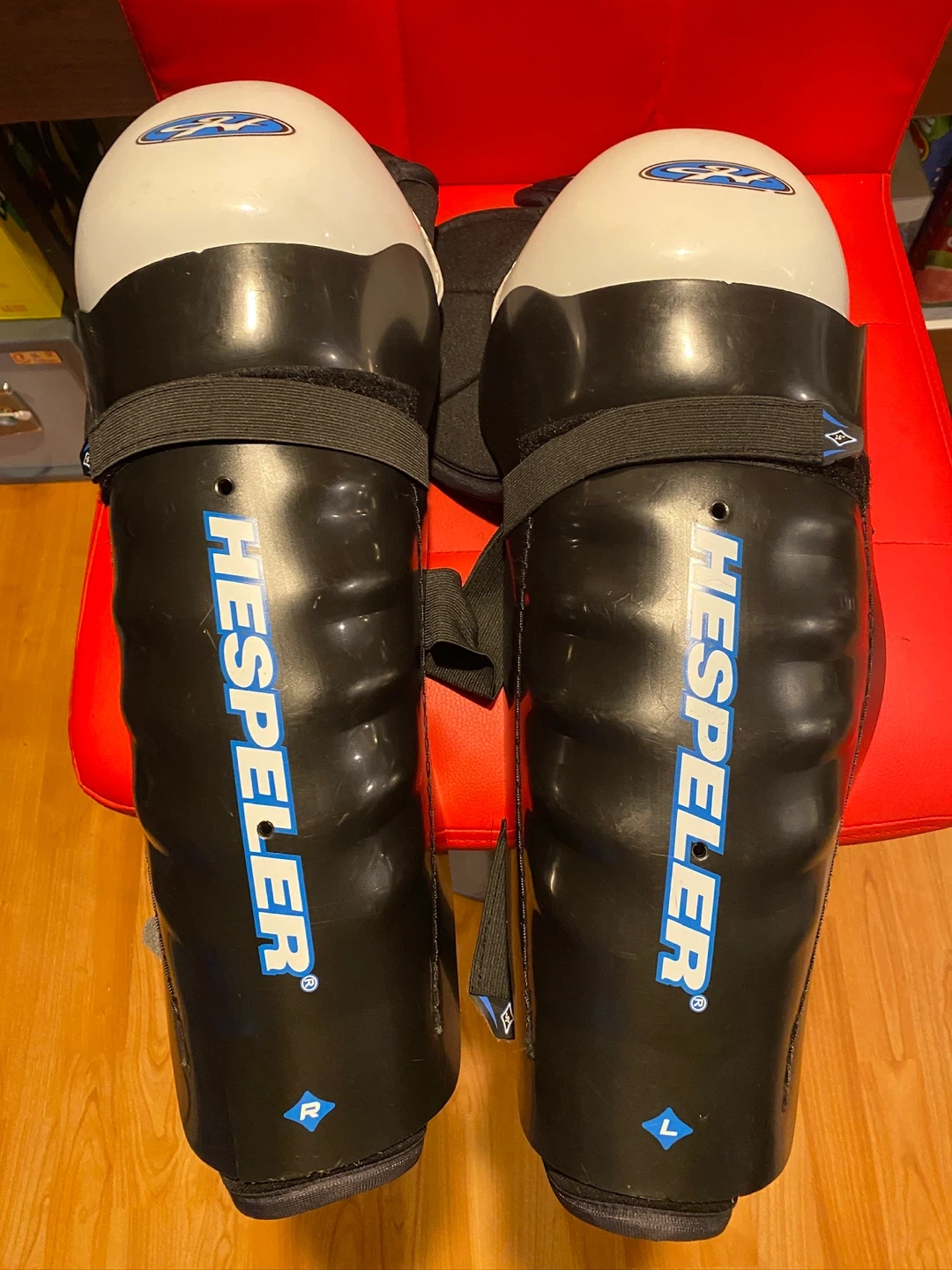 Selling a pair of Hespeler hockey shin guards in senior size 16". They are black with blue accents and in great shape for protecting your shins on the ice! The size is marked as SR 16.
