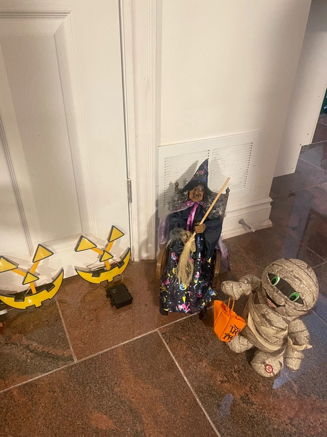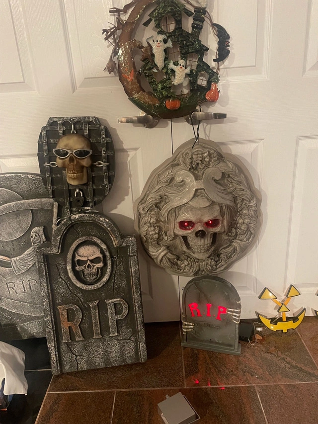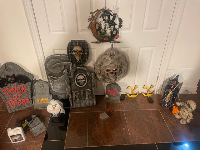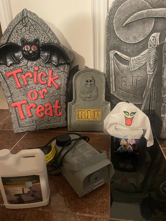 Spookify your haunted house with this Halloween decorations lot! This creepy collection includes tombstones, animated props, and eerie lighting to set the perfect terrifying tone for your Halloween haunt! ready to scare trick-or-treaters! Included: * Tombstones * Animated props * Lighting * Fog machine Inquire about pricing