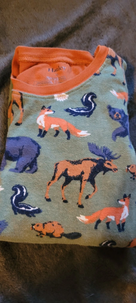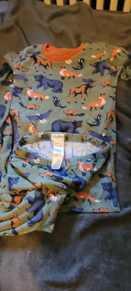 Super cute Hatley kids pajamas in size 10! The pajamas feature a fun all-over print with bears, moose, foxes, and other woodland creatures on an olive green background. Made from 100% organic cotton, they're soft and comfy for a good night's sleep....good condition no rips or tears plenty of life left