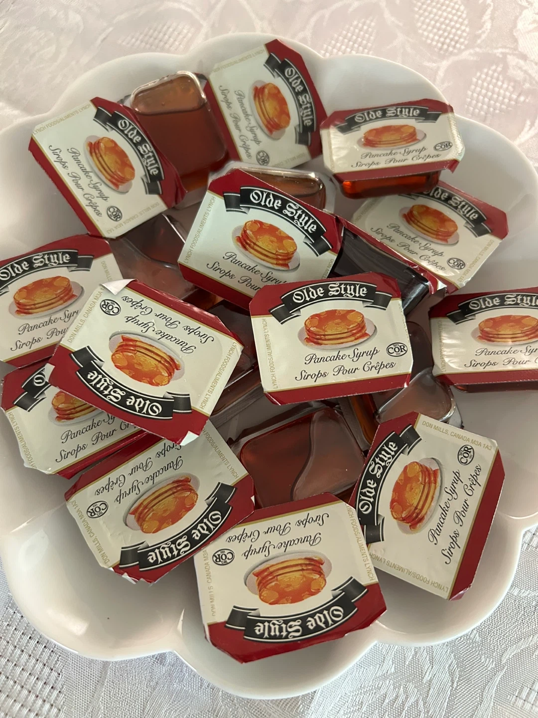 Individual servings of Olde Style pancake syrup, perfect for on-the-go or portion control! These are great for camping or to have with you when you're out and about Plate NOT included